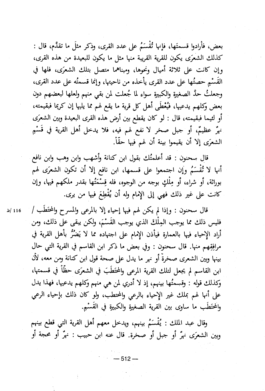 قال سحنون: وإذا لم يكن لهم فيها إحياء إلا بالمرعى والمسرح والمحتطب/فليس ذلك مما يوجب الملك الذي يوجب القسم، ولكن يبقى على ذلك، ومن أراد الإحياء فيها بالعمارة فيأذن الإمام على اجتهاده مما لا يضر بأهل القرية في مرافقهم منها. قال سحنون: وفي بعض ما ذكر ابن القاسم في القرية التي حال بينها وبين الشعري صخرة أو نهر ما يدل على صحة قول ابن كنانة ومن معه، لأن ابن القاسم لم يجعل لتلك القرية المرعى والمحتطب في الشعري حظا في قسمتها، وكذلك قوله: وقبسمتها بينهم، إذ لا أدري لمن هي منهم وكلهم يدعيها، فهذا يدل على أنها لهم بملك غير الإحياء بالرعي والمحتطب، ولو كان ذلك بإحياء الرعي والمحتطب ما ساوى بين القرية الصغيرة والكبيرة في القسم.