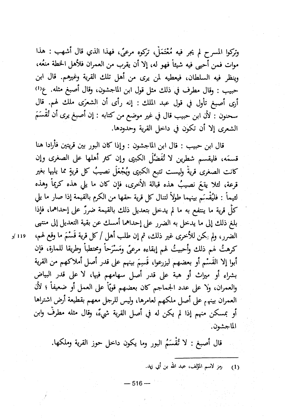 قال ابن حبيب: قال ابن الماجشون: وإذا كان البور بين قريتين فأرادا هنا قسمه، فليقسم شطرين لا تفضل الكبرى وإن كثر أهلها على الصغرى وإن كانت الصغرى قرية وليست تتبع الكبرى ويجعل نصيب كل قرية مما يليها بغير قرعة، لئلا يقع تصيب هذه قبالة الأخرى، فإن كان ما يلي هذه كريما وهذه لئيما: فليقسم بينهما طولا لتنال كل قرية حقها من الكرم بالقيمة إذا صار ما يلي كل قرية ما ينتفع به ما لم يدخل بتعديل ذلك بالقيمة ضرر على إحداهما، فإذا بلغ ذلك إلى ما يدخل به الضرر على إحداهما أمسك عن بقية التعديل إلى منتهي الضرر، ولم يكن للأخرى غير ذلك، ثم إن طلب أهل/كل قرية قسم ما وقع لهم، كرهت لهم ذلك وأحبيت لهم إبقاءه مرعى ومسرحا ومحتطبأ وطريقا للمارة، فإن أبوا إلا القسم أو بعضهم ليزرعوا، قسم بينهم على قدر أصل أملاكهم من القرية بشراء أو ميراث أو هبة على قدر أصل سهامهم فيها، لا على قدر البياض والعمران، ولا على عدد الجماجم كان بعضهم قويا على العمل أو ضعيفا؛ لأن العمران بينهم على أصل ملكهم لعامرها، وليس للرجل معهم بقطيعة أرض اشتراها أو بمسكن منهم إذا لم يكن له في أصل القرية شيء، وقال مثله مطرف وابن الماجشون.