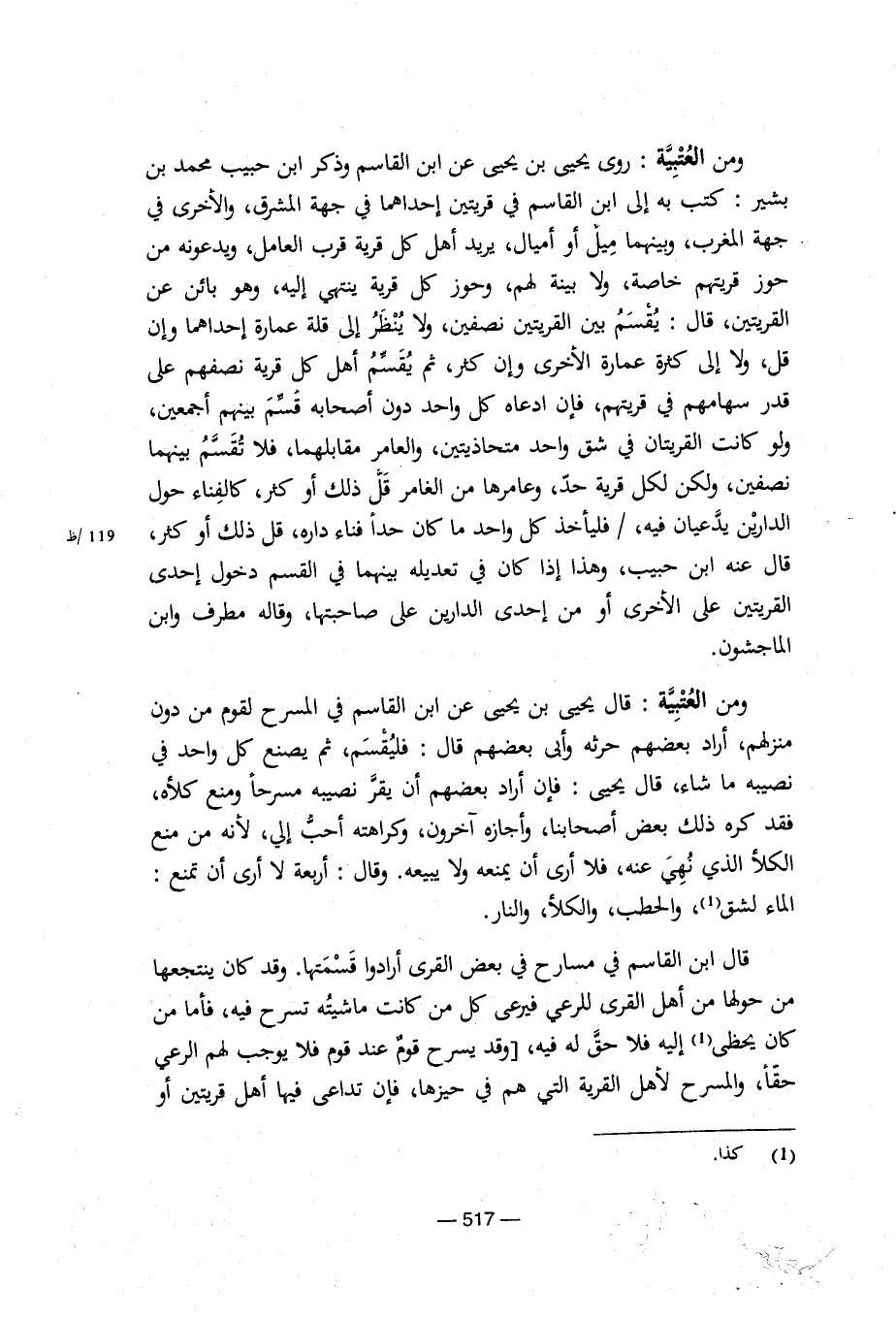 ومن العتبية: قال يحيى بن يحيى عن ابن القاسم في المسرح لقوم من دون منزلهم، أراد بعضهم حرثه وأبى بعضهم قال: فليقسم، ثم يصنع كل واحد في نصيبه ما شاء، قال يحيى: فإن أراد بعضهم أن يقر نصيبه مسرحا ومنع كلأه، فقد كره ذلك بعض أصحابنا، وأجازه آخرون، وكراهته أحب إلي، لأنه من منع الكلأ الذي نهي عنه، فلا أري أن يمنعه ولا يبيعه. وقال: أربعة لا أرى أن تمنع: الماء لشق، والحطب، والكلأ، والنار.