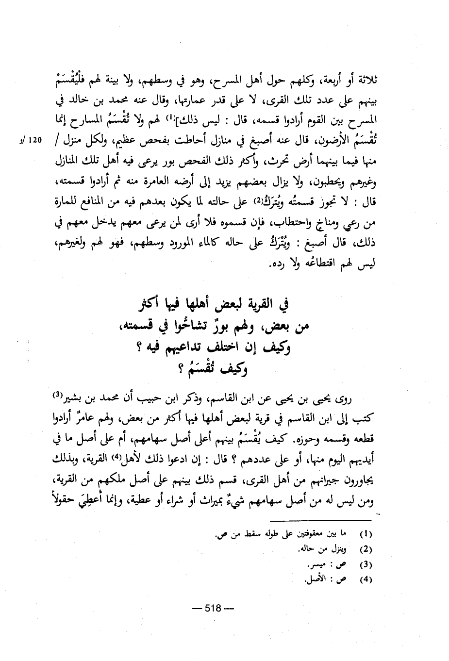 ثلاثة أو أربعة، وكلهم حول أهل المسرح، وهو في وسطهم، ولا بينة لهم فليقسم بينهم على عدد تلك القرى، لا على قدر عمارتها، وقال عنه محمد بن خالد في المسرح بين القوم أرادوا قسمه، قال: ليس ذلك] لهم ولا تقسم المسارح إنما تقسم الأرضون، قال عنه اصبغ في منازل أحاطت بفحص عظيم، ولكل منزل/منها فيما بينهما أرض تحرث، وأكثر ذلك الفحص بور يرعى فيه أهل تلك المنازل وغيرهم ويحطبون، ولا يزال بعضهم يزيد إلى أرضه العامرة فيه من المنافع للمارة من رعي ومناخ واحتطاب، فإن قسموه فلا أرى لمن يرعى معهم يدخل معهم في ذلك، قال أصبغ: ويترك على حاله كالماء المورود وسطهم، فهو لهم ولغيرهم، ليس لهم اقتطاعه ولا رده.