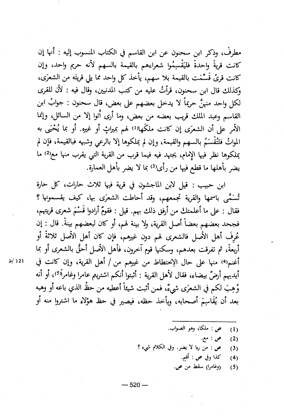 مطرف، وذكر ابن سحنون عن ابن القاسم في الكتاب المنسوب إليه: أنها إن كانت قرية واحدة فليقسموا شعراءهم بالقيمة بالسهم لأنه حريم واحد، وإن كانت قرى قسمت بالقيمة بلا سهم، يأخذ كل واحد مما يلي قريته من الشعري، وكذلك قال ابن سحنون، قرأت عليه من كتب المدنيين، وقال فيه: لأن للقرى لكل واحد منهن حريما لا يدخل بعضهم على بعض، قال سحنون: جواب ابن القاسم وعبد الملك قريب بعضه من بعض، وما أرى أتوا إلا من السائل، وإنما الأمر على أن الشعري إن كانت ملكها لهم بميراث أو غيره. أو بما يحيى به الموات فلتقسم بالسهم والقيمة، وإن لم يملكوها إلا بالرعي وشبهه فبالقيمة، فإن لم يملكوها نظر فيها الإمام، يجتهد فيه فيما قرب من القرية التي يقرب منها مع ما يضر بأهلها ما قطع فيها من رأى بما لا يضر بأهل العمارة.