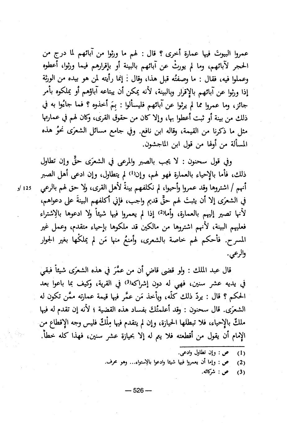وفي قول سحنون: لا يحب بالصبر والمرعى في الشعري حق وإن تطاول ذلك، فأما بالإحياء بالعمارة فهو لهم، وإن لم يتطاول، وإن ادعى أهل الصبر أنهم/اشتروها وقد عمروا وأحيوا، لم نكلفهم بينة لأهل القرى، ولا حق لهم بالرعي في الشعري إلا أن يثبت لهم حق قديم واجب، فإني اكلفهم البينة على دعواهم، لأنها تصير إليهم بالعمارة، وأما إذا لم يعمروا فيها شيئا ولا ادعوها بالاشتراء فعليهم البينة، لأنهم اشتروها من مالكين قد ملكوها بإحياء متقدم، وعمل غير المسرح. فأحكم لهم خاصة بالشعري، وأمنع منها من لم يملكها بغير الجوار والرعي.