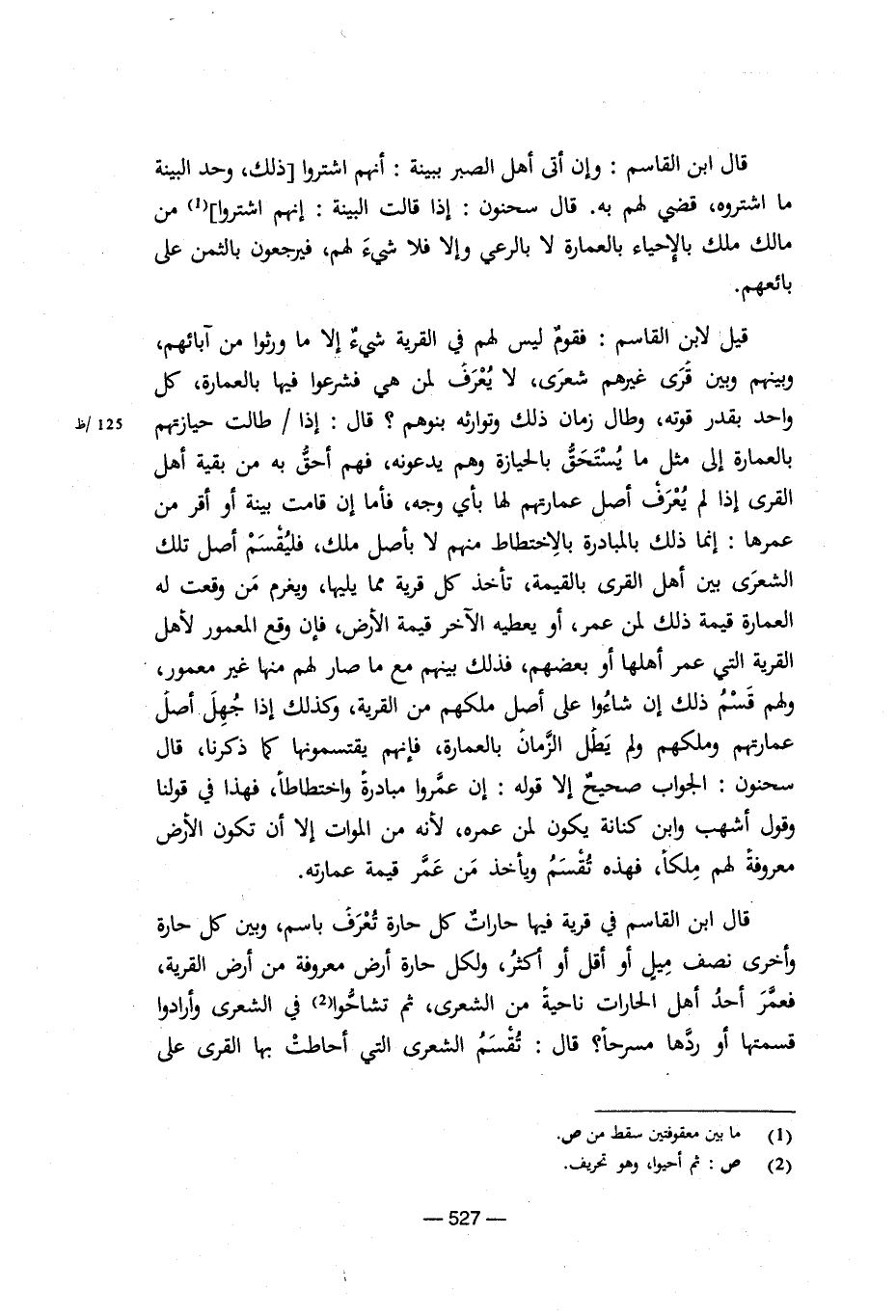 قيل لابن القاسم: فقوم ليس لهم في القرية شيء إلا ما ورثوا من آبائهم، وبينهم وبين قرى غيرهم شعرى، لا يعرف لمن هي فشرعوا فيها بالعمارة، كل واحد بقدر قوته، وطال زمان ذلك وتوارثه بنوهم؟ قال: إذا/طالت حيازتهم بالعمارة إلى مثل ما يستحق بالحيازة وهم يدعونه، فهم أحق به من بقية أهل القرى إذا لم يعرف أصل عمارتهم لها بأي وجه، فأما إن قامت بينة أو أقر من عمرها: إنما ذلك بالمبادرة بالاختطاط منهم لا بأصل ملك، فليقسم أصل تلك الشعرى بين أهل القرى بالقيمة، تأخذ كل قرية مما يليها، ويغرم من وقعت له العمارة قيمة ذلك لمن عمر، أو يعطيه الآخر قيمة الأرض، فإن وقع المعمور لأهل القرية التي عمر أهلها أو بعضهم، فذلك بينهم مع ما صار لهم منها غير معمور، ولهم قسم ذلك إن شاءوا على أصل ملكهم من القرية، وكذلك إذا جهل أصل عمارتهم وملكهم ولم يطل الزمان بالعمارة، فإنهم يقتسمونها كما ذكرنا، قال سحنون: الجواب صحيح إلا قوله: إن عمروا مبادرة واختطاطا، فهذا في قولنا وقول أشهب وابن كنانة لمن عمره، لأنه من الموات إلا أن تكون الأرض معروفة لهم ملكا، فهذه تقسم ويأخذ من عمر قيمة عمارته.