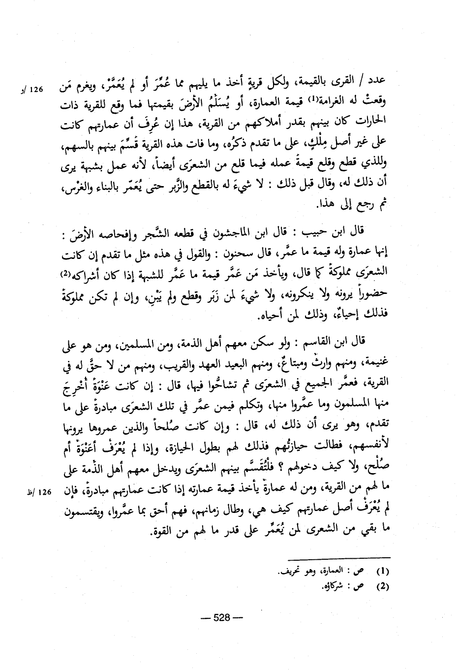عدد/القرى بالقيمة، ولكل قرية أخذ ما يليهم مما عمر أو لم يعمر، ويغرم من وقعت له الغرامة قيمة العمارة، أو يسلم الأرض بقيمتها فما وقع للقرية ذات الحارات كان بينهم بقدر أملاكهم من القرية، هذا إن عرف أن عمارتهم كانت على غير أصل ملك، على ما تقدم ذكره، وما فات هذه القرية قسم بينهم بالسهم، وللذي قطع وقلع قيمة عمله فيما قلع من الشعرى أيضًا، لأنه عمل بشبهة يرى أن ذلك له، وقال قبل ذلك: لا شيء له بالقطع والزبر حتى يعمر بالبناء والغرس، ثم رجع إلى هذا.