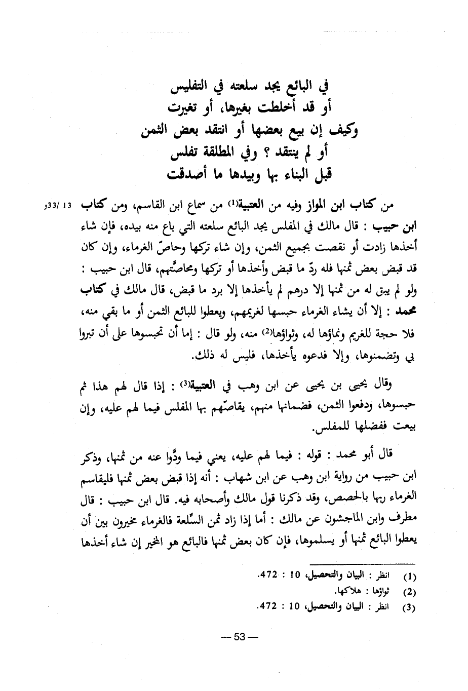 وقال يحيى بن يحيى عن ابن وهب في العتبية: إذا قال لهم هذا ثم حبسوها، ودفعوا الثمن، فضمانها منهم، يقاصهم بها المفلس فيما لهم عليه، وإن بيعت ففضلها للمفلس.