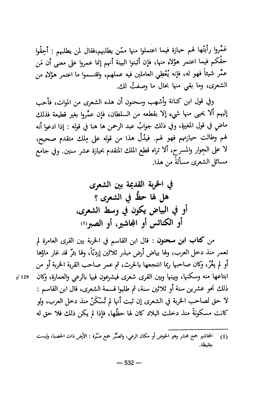 من كتاب ابن سحنون: قال ابن القاسم في الخربة بين القرى العامرة لم تعمر منذ دخل العرب، ولها بياض أرض مبذر ثلاثين إردبا، ولها بئر قد غار ماءها أو لم يغر، وكان صاحبها ربما انتجعها بالحرث، ثم عمر صاحب القرية الخربة أو من ابتاعها منه وسكنها، وبينها وبين القرى شعري فيشرعون فيها بالرعي والعمارة، وكان ذلك نحو عشرين سنة أو ثلاثين سنة، ثم طلبوا قسمة الشعري، قال ابن القاسم: لا حق لصاحب الخربة في الشعري إن ثبت أنها لم تسكن منذ دخل العرب، ولو كانت مسكونة منذ دخلت البلاد كان لها حظها، فإذا لم يكن ذلك فلا حق له