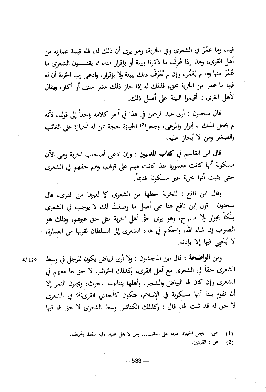 وقال ابن نافع: للخربة حظها من الشعري كما لغيرها من القرى، قال سحنون: قول ابن نافع هنا على أصل ما وصفت لك لا يوجب في الشعري ملكا بجوار ولا مسرح، وهو يرى حق أهل الخربة مثل حق غيرهم، وذلك هو الصواب إن شاء الله، والحكم في هذه الشعري إلى السلطان لقربها من العمارة، لا يحيى فيها إلا بإذنه.