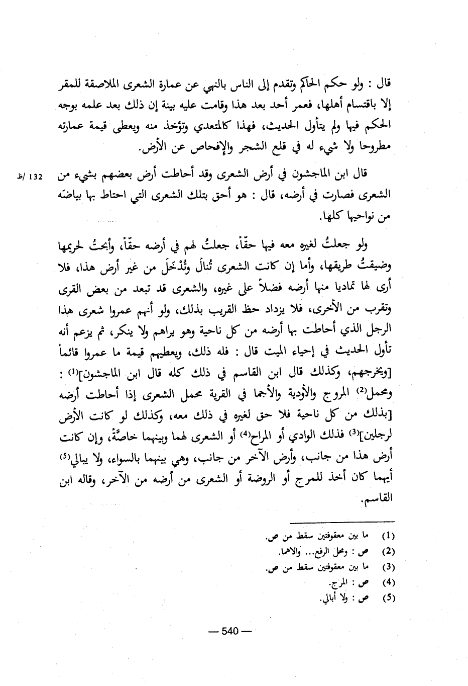 قال ابن الماجشون في أرض الشعري وقد أحاطت أرض بعضهم بشيء من الشعري فصارت في أرضه، قال: هو أحق بتلك الشعري التي احتاط بها بياضه من نواحيها كلها.