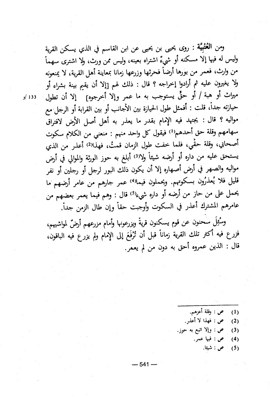 ومن العتبية: روى يحيى بن يحيى عن ابن القاسم في الذي يسكن القرية وليس له فيها إلا مسكنه أو شيء اشتراه بعينه، وليس ممن ورث، ولا اشترى سهما من وارث، فعمر من بورها أرضا فحرثها وزرعها زمانا بمعاينة أهل القرية، لا يمنعونه ولا يغيرون عليه ثم أرادوا إخراجه؟ قال: ذلك لهم [إلا أن يقيم بينة بشراء أو ميراث أو هبة/أو حق يستوجب به ما عمر وإلا أخرجوه] إلا أن تطول حيازته جدا، قلت: أفمثل طول الحيازة بين الأجانب أو بين القرابة أو الرجل مع مواليه؟ قال: يجتهد فيه الإمام بقدر ما يعذر به أهل أصل الأرض لافتراق سهامهم وقلة حق أحدهم فيقول كل واحد منهم: منعني من الكلام سكوت أصحابي، وقلة حقي، فلما خفت طول الزمان قمت، فهذا أعذر من الذي يستحق عليه من داره أو أرضه شيئا ولا أبلغ به حوز الورثة والموالي في أرض مواليه والصهر في أرض أصهاره إلا أن يكون ذلك البور لرجل أو رجلين أو نفر قليل فلا يغدرون بسكوتهم. ويحملون فيما عمر جارهم من عامر أرضهم ما يحمل على من حاز من أرضه أو داره شيء قال: وهم فيما يعمر بعضهم من عامرهم المشترك أعذر في السكوت وأوجبت حقا وإن طال الزمن جدا.