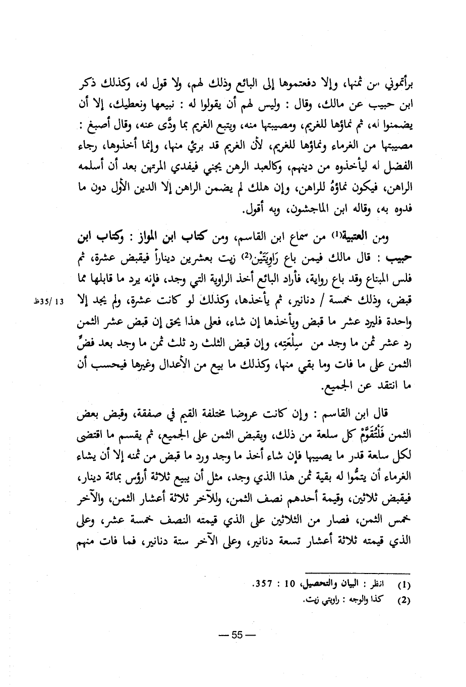 ومن العتبية من سماع ابن القاسم، ومن كتاب ابن المواز: وكتاب ابن حبيب: قال مالك فيمن باع راويتين زيت بعشرين دينارا فيقبض عشرة، ثم فلس المبتاع وقد باع رواية، فأراد البائع أخذ الرواية التي وجد، فإنه يرد ما قابلها مما قبض، وذلك خمسة/دنانير، ثم يأخذها، وكذلك لو كانت عشرة، ولم يجد إلا واحدة فليرد عشر ما قبض ويأخذها إن شاء، فعلى هذا يحق إن قبض عشر الثمن رد عشر ثمن ما وجد من سلعته، وإن قبض الثلث رد ثلث ما وجد بعد فض الثمن على ما فات وما بقي منها، وكذلك ما بيع من الأعدال وغيرها فيحسب أن ما انتقد عن الجميع.