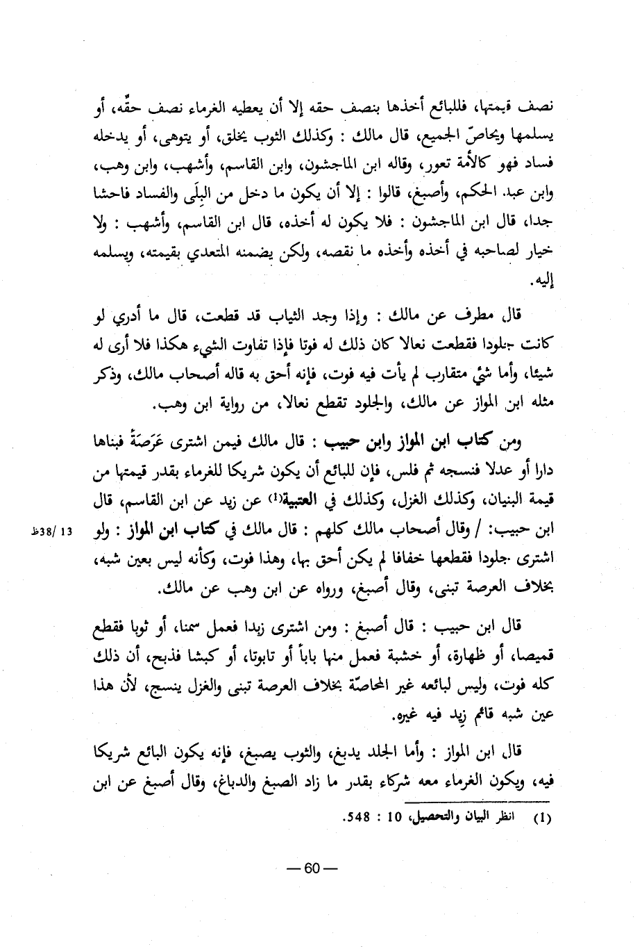ومن كتاب ابن المواز وابن حبيب: قال مالك فيمن اشترى عرصة فبناها دارا أو عدلا فنسجه ثم فلس، فإن للبائع أن يكون شريكا للغرماء بقدر قيمتها من قيمة البنيان، وكذلك الغزل، وكذلك في العتبية عن زيد عن ابن القاسم، قال ابن حبيب:/وقال أصحاب مالك كلهم: قال مالك في كتاب ابن المواز: ولو اشترى جلودا فقطعها خفافا لم يكن أحق بها، وهذا فوت، وكأنه ليس بعين شبه، بخلاف العرصة تبنى، وقال أصبغ، ورواه عن ابن وهب عن مالك.