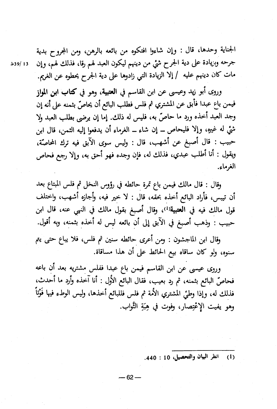 وقال: قال مالك فيمن باع تمرة حائطه في رؤوس النخل ثم فلس المبتاع بعد أن تيبس، فأراد البائع أخذه بحقه، قال: لا خير فيه، وأجازه أشهب، واختلف قول مالك فيه في العتبية، وقال أصبغ بقول مالك في النهي عنه، قال ابن حبيب: وذهب أصبغ في الآبق إلى أن بائعه ليس له أخذه بثمنه، وبه أقول.