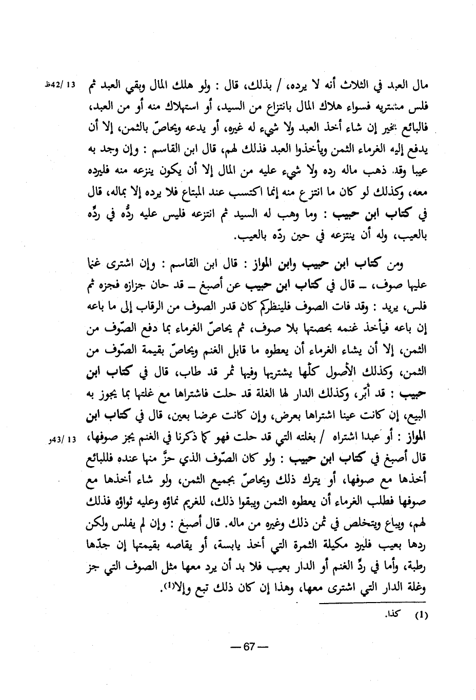 مال العبد في الثلاث أنه لا يرده،/بذلك، قال: ولو هلك المال وبقي العبد ثم فلس مشتريه فسواء هلاك المال بانتزاع من السيد، أو استهلاك منه أو من العبد، فالبائع مخير إن شاء أخذ العبد ولا شيء له غيره، أو يدعه ويحاص بالثمن، إلا أن يدفع إليه الغرماء الثمن ويأخذوا العبد فذلك لهم، قال ابن القاسم: وإن وجد به عيبا وقد ذهب ماله رده ولا شيء عليه من المال إلا أن يكون ينزعه منه فليرده معه، وكذلك لو كان ما انتزع منه إنما اكتسب عند المبتاع فلا يرده إلا بماله، قال في كتاب ابن حبيب: وما وهب له السيد ثم انتزعه فليس عليه رده في رده بالعيب، وله أن ينتزعه في حين رده بالعيب.