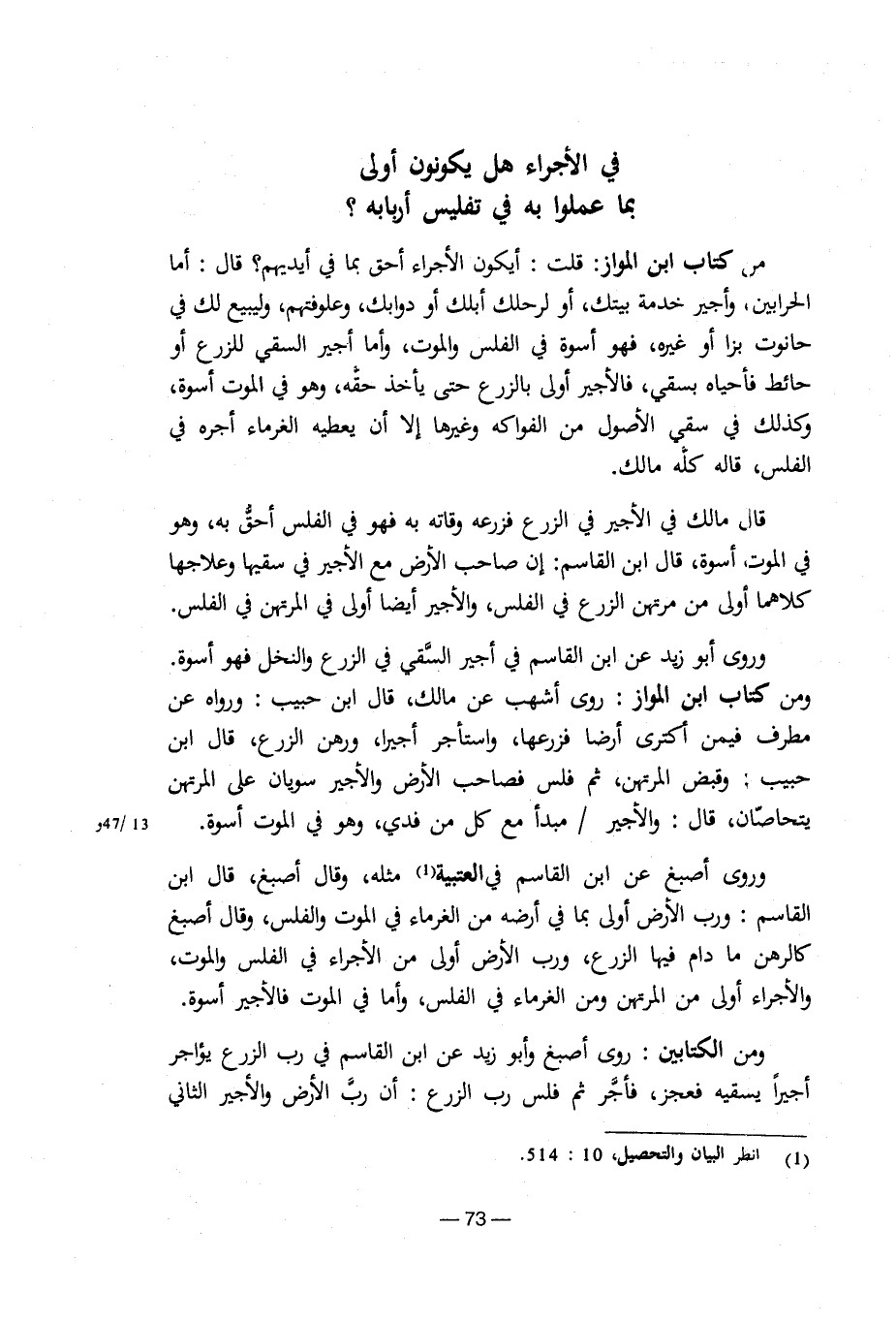 وروى أبو زيد عن ابن القاسم في أجي السقي في الزرع والنخل فهو أسوة. ومن كتاب ابن المواز: روى أشهب عن مالك، قال ابن حبيب: ورواه عن مطرف فيمن اكترى أرضا فزرعها، واستأجر أجيرا، ورهن الزرع، قال ابن حبيب: وقبض المرتهن، ثم فلس فصاحب الأرض والأجير سويان على المرتهن يتحاصان، قال: والأجير/مبدأ مع كل من فدي، وهو في الموت أسوة.