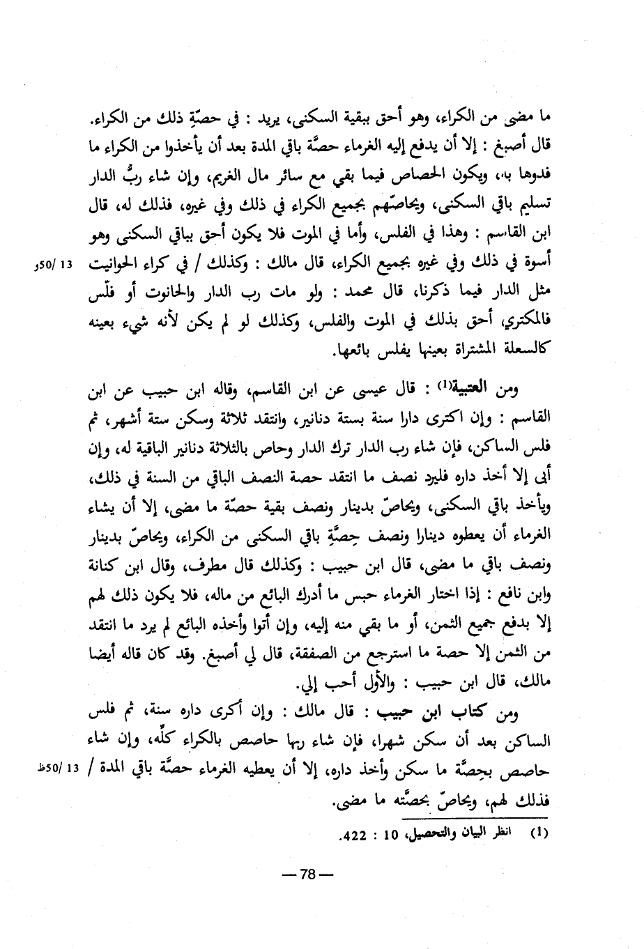 ما مضى من الكراء، وهو أحق ببقية السكنى، يريد: في حصة ذلك من الكراء. قال أصبغ: إلا أن يدفع إليه الغرماء حصة باقي المدة بعد أن يأخذوا من الكراء ما فدوها به، ويكون لحصاص فيما في بقي مع سائر مال الغريم وإن ساء رب الدار تسليم باقي السكني، ويحاصهم بجميع الكراء في ذلك وفي غيره، فذلك له، قال ابن القاسم: وهذا في الفلس، وأما في الموت فلا يكون أحق بباقي السكني وهو أسوة في ذلك وفي غيره بجميع الكراء، قال مالك: وكذلك/في كراء الحوانيت مثل الدار فيما ذكرنا، قال محمد: ولو مات رب الدار والحانوت أو فلس فالمكتري أحق بذلك في الموت والفلس، وكذلك لو لم يكن لأنه شيء بعينه كالسعلة المشتراة بعينها يفلس بائعها.