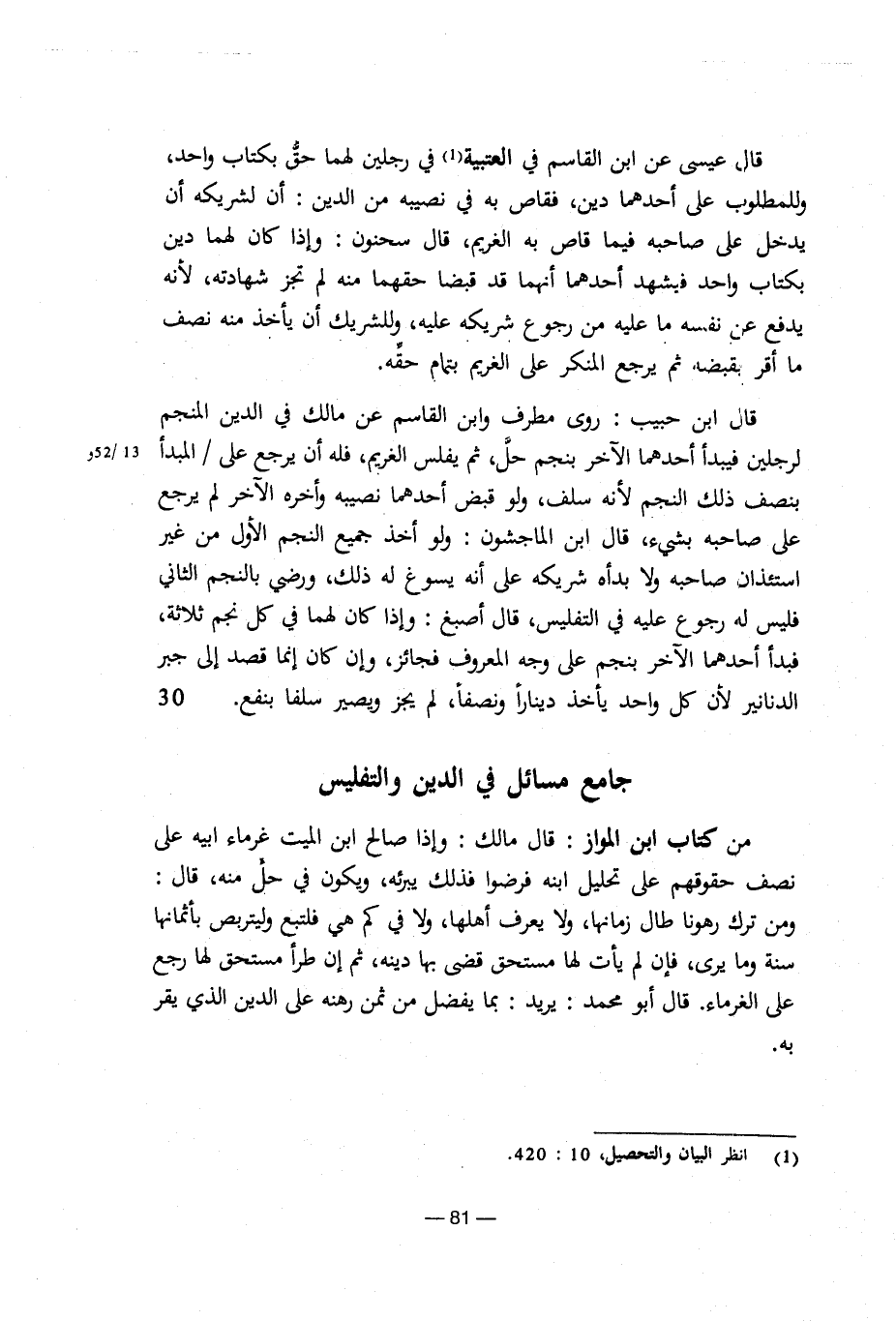 قال ابن حبيب: روى مطرف وابن القاسم عن مالك في الدين المنجم لرجلين فيبدأ الآخر بنجم حل، ثم يفلس الغريم، فله أن يرجع على/المبدأ بنصف ذلك النجم لأنه سلف، ولو قبض أحدهما نصيبه وأخره الآخر لم يرجع على صاحبه بشيء، قال ابن الماجشون: ولو أخذ جميع النجم الأول من غير استئذان صاحبه ولا بدأه شريكه على أنه يسوغ له ذلك، ورضي بالنجم الثاني فليس له رجوع عليه في التفليس، قال أصبغ: وإذا كان لهما في كل نجم ثلاثة، فبدأ أحدهما الآخر بنجم على وجه المعروف فجائز، وإن كان إنما قصد إلى جبر الدنانير لأن كل واحد يأخذ دينارا ونصفا، لم يجز ويصير سلفا بنفع.