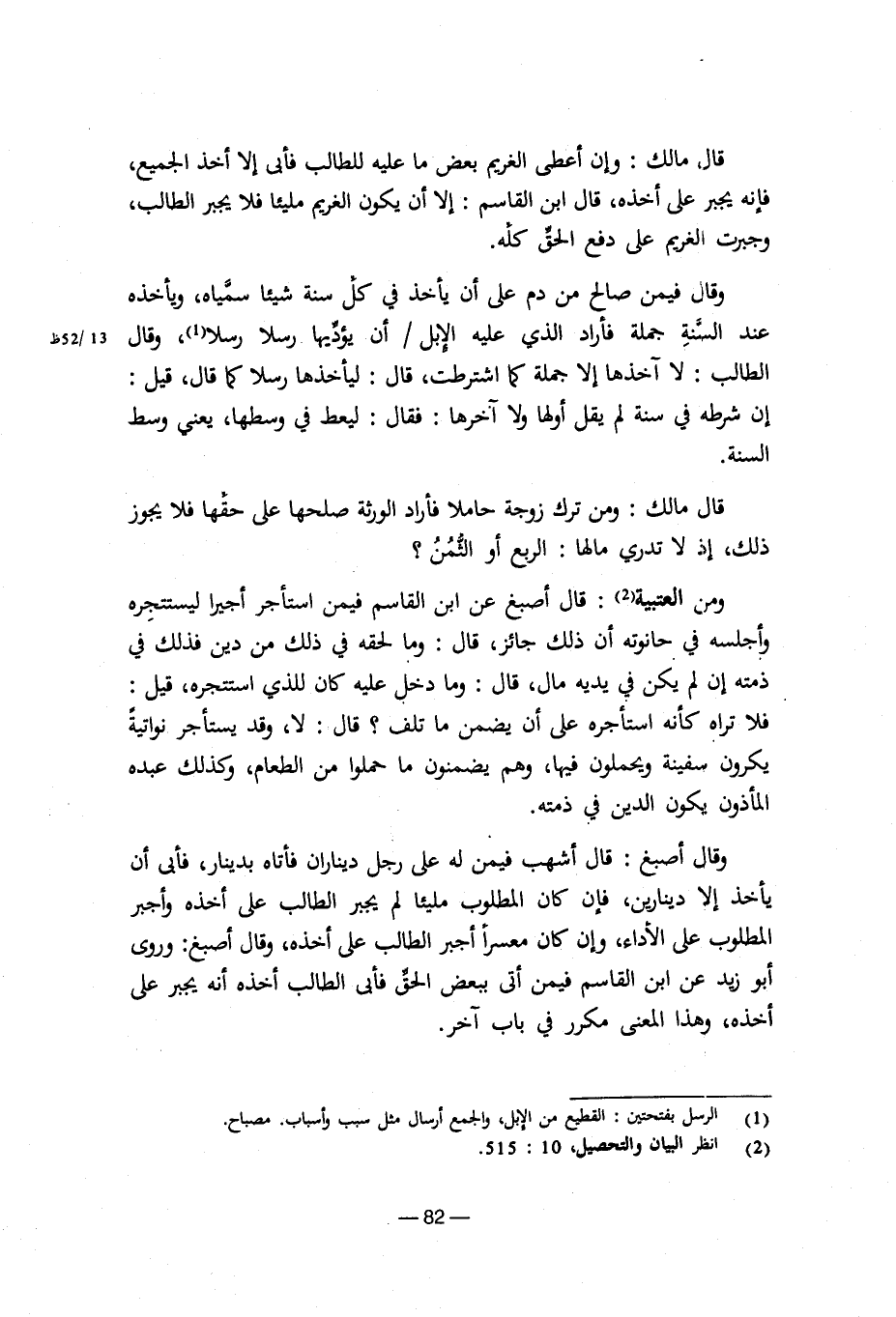 وقال فيمن صالح من دم على أن يأخذ في كل سنة شيئا سمياه، ويأخذه عند السنة جملة فأراد الذي عليه الإبل/أن يؤديها رسلا رسلا، وقال الطالب: لا آخذها إلا جملة كما اشترطت، قال: ليأخذها رسلا كما قال، قيل: إن شرطه في سنة لم يقل أولها ولا آخرها: فقال: ليعط في وسطها، يعني وسط السنة.