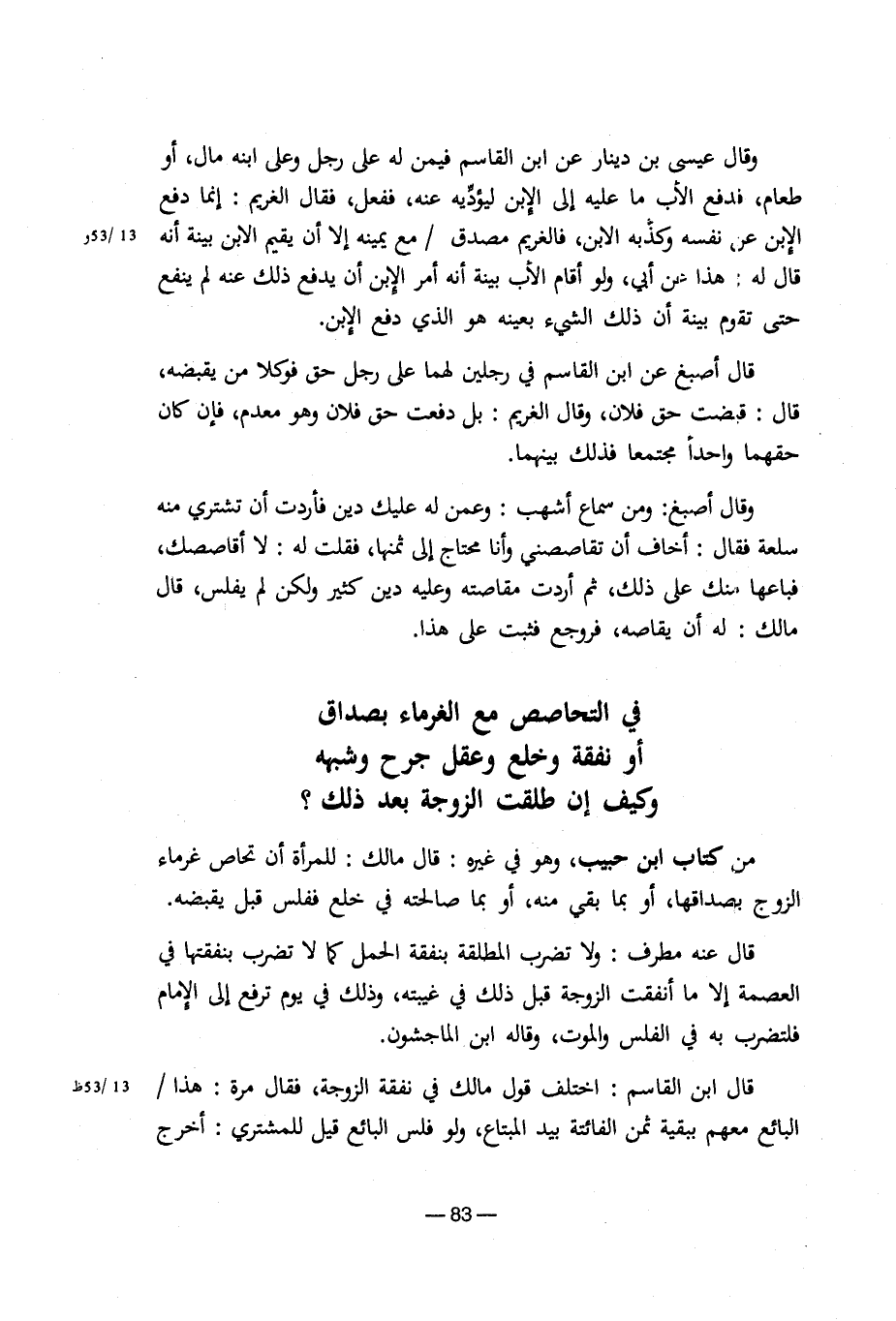 من كتاب ابن حبيب، وهو في غيره: قال مالك: للمرأة أن تحاص غرماء الزوج بصداقها، أو بما بقي منه، أو بما صالحته في خلع ففلس قبل يقبضه.