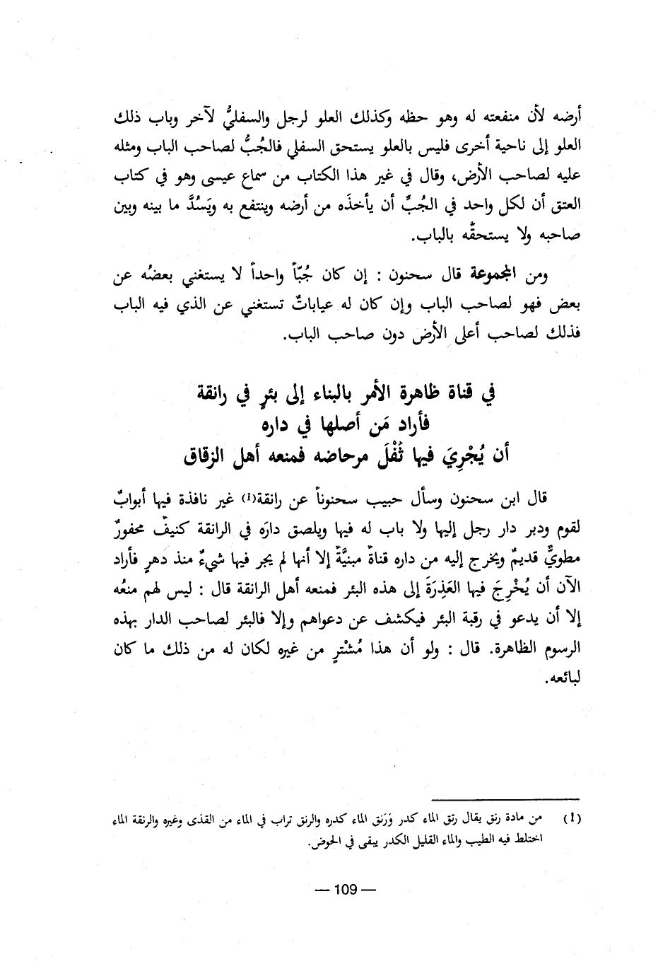 قال ابن سحنون وسأل حبيب سحنوناً عن رانقة (¬1) غير نافذة فيها أبوابٌ لقوم ودبر دار رجل إليها ولا باب له فيها ويلصق داره في الرانقة كنيف محفور مطوي قديم ويخرج إليه من داره قناةٌ مبنية إلا أنها لم يجر فيها شيء منذ دهرٍ فأراد الآن أن يُخرج فيها العَذِرةَ إلى هذه البئر فمنعه أهل الرانقة قال: ليس لهم منعُه إلا أن يدعو في رقبة البئر فيكشف عن جعواهم وإلا فالبئر لصاحب الدار بهذه الرسوم الظاهرة. قال: ولو أن هذا مُشتر من غيره لكان له من ذلك ما كان لبائعه.