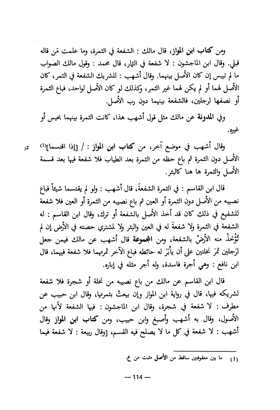 قال ابن القاسم عن مالك من باع نصيبه من نخلة أو شجرة فلا شفعة لشريكه فيها، قال في رواية ابن المواز وإن بيعت بثمرتها، وقال ابن حبيب عن مطرف: لا شفعة في شجرة، وقال ابن الماجشون: فيها الشفعة لأنها من الأصول، وقال به أشهب وأصبغ وابن حبيب، ومن كتاب ابن المواز وقال أشهب: لا شفعة في كل ما لا يصلح فيه القسم، [وقال ربيعة: لا شفعة فيما ¬__________