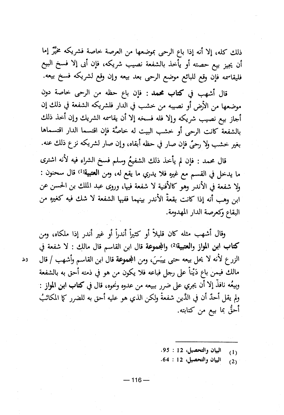 وقال أشهب مثله كان قليلاً أو كثيراً أندراً أو غير أندر إذا ملكاه، ومن كتاب ابن المواز والعتبية (¬2) والمجموعة قال ابن القاسم قال مالك: لا شفعة في الزرع لأنه لا يحل بيعه حتى ييبس، ومن المجموعة قال ابن القاسم وأشهب/ قال مالك فيمن باع ديناً على رجل فباعه فلا يكون من هو في ذمته أحق به بالشفعة وبيعثه نافذ إلا ان يجري على ضرر ببيعه من عدوه ونحوه، قال في كتاب ابن المواز: ولم يقل أحدٌ أن في الدين شفعةً ولكن الذي هو عليه أحق به للضرر كما المكاتب أحق بما بيع من كتابته.