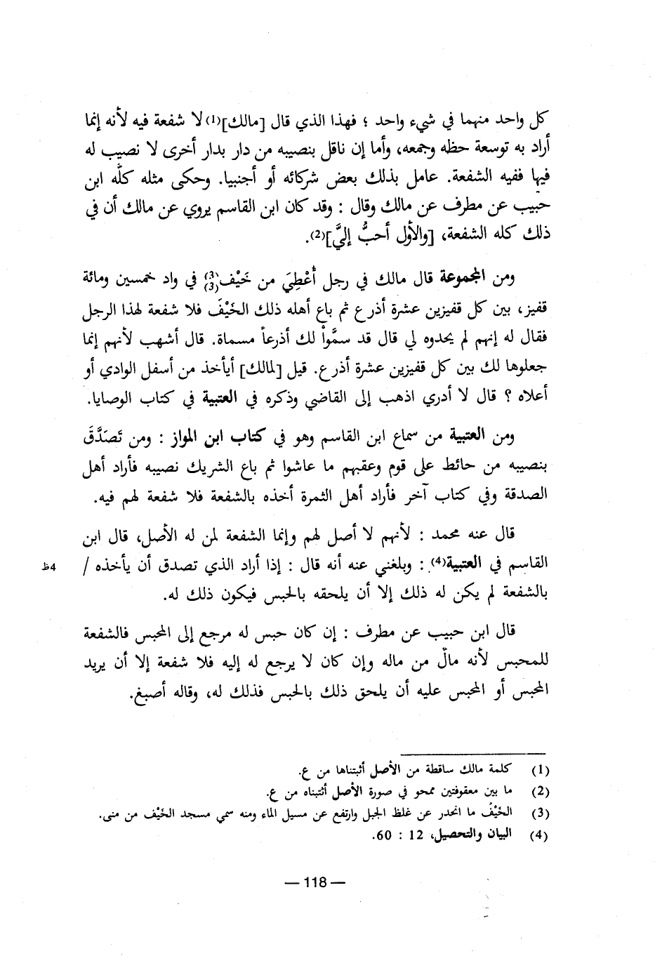 قال عنه محمد: لأنهم لا أصل لهم وإنما الشفعة لمن له الأصل، قال ابن القاسم في العتبية (¬4): وبلغني عنه أنه قال: إذا أراد الذي تصدق أن يأخذه/ بالشفعة لم يكن له ذلك إلا أن يلحقه بالحبس فيكون ذلك له،