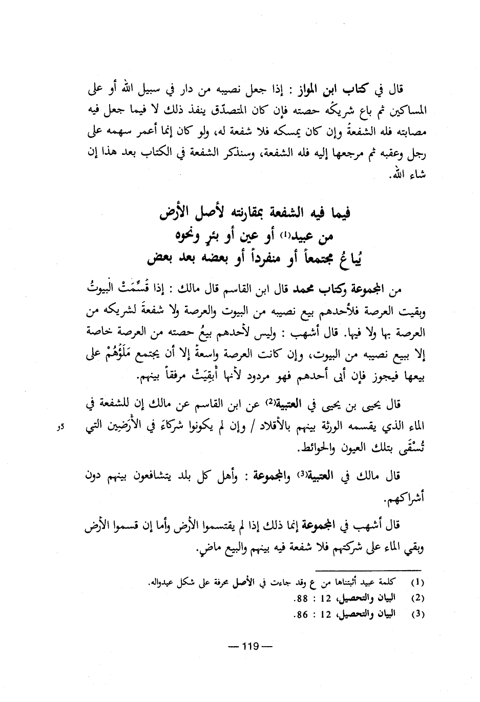 قال يحيى بن يحيى في العتبية (¬2) عن ابن القاسم عن مالك إن للشفعة في الماء الذي يقسمه الورثة بينهم بالأقلاد/ وإن لم يكونوا شركاء في الأرضين التي تُسقى بتلك العيون والحوائط.