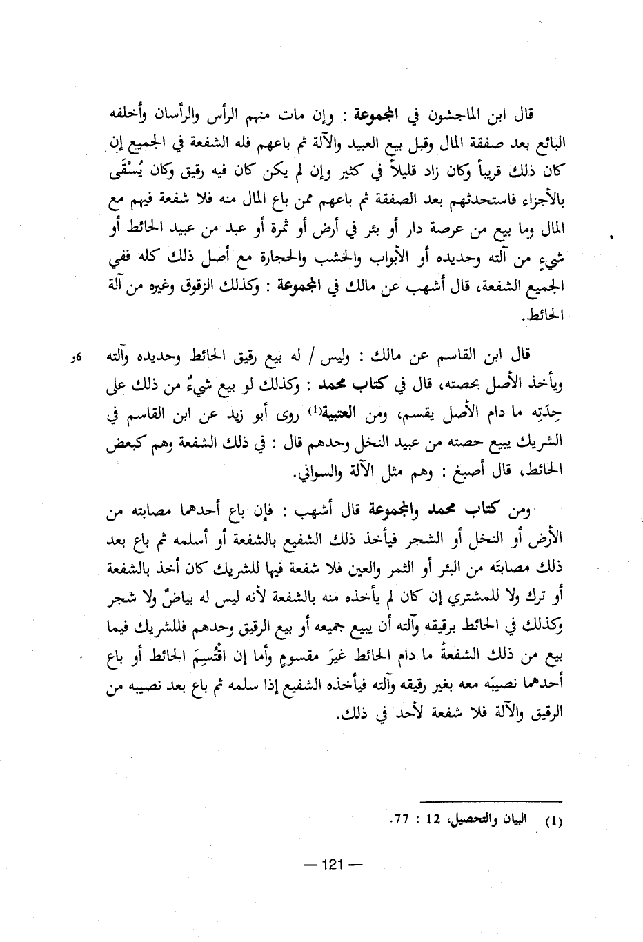 قال ابن الماجشون في المجموعة: وإن مات منهم الرأس والرأسان وأخلفه البائع بعد صفقة المال وقبل بيع العبيد والآلة ثم باعهم فله الشفعة في الجميع إن كان ذلك قريباً وكان زاد قليلاً في كثير وإن لم يكن كان فيه رقيق وكان يسقى بالأجزاء فاستحدثهم بعد الصفقة ثم باعهم ممن باع المال منه فلا شفعة فيهم مع المال وما بيع من عرصة دار أو بئر في أرض أو ثمرة أو عبد من عبيد الحائط أو شيءٍ من آلته وحديده أو الأبواب والخشب والحجارة مع أصل ذلك كله ففي الجميع الشفعة، قال أشهب عن مالك في المجموعة: وكذلك الزقوق وغيره من آلة الحائط.