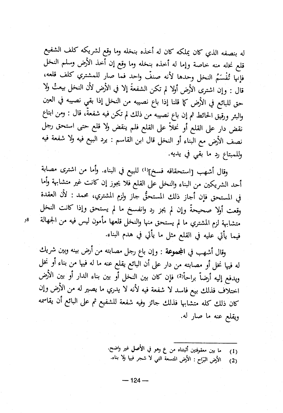 وقال أشهب في المجموعة: وإن باع رجل مصابته من أرض بينه وبين شريك له فيها نخل أو مصابته من دار على أن البائع يقلع عنه ما له فيها من بناء أو نخل ويدفع إليه أرضاً براحاً (¬2) فإن كان بين النخل أو بين بناء الدار أو بين الأرض اختلاف فذلك بيع فاسد لا شفعة فيه لأنه لا يدري ما يصير له من الأرض وإن كان ذلك كله متشابهاً فذلك جائز وفيه شفعة للشفيع ثم على البائع أن يقاسمه ويقلع عنه ما صار له.