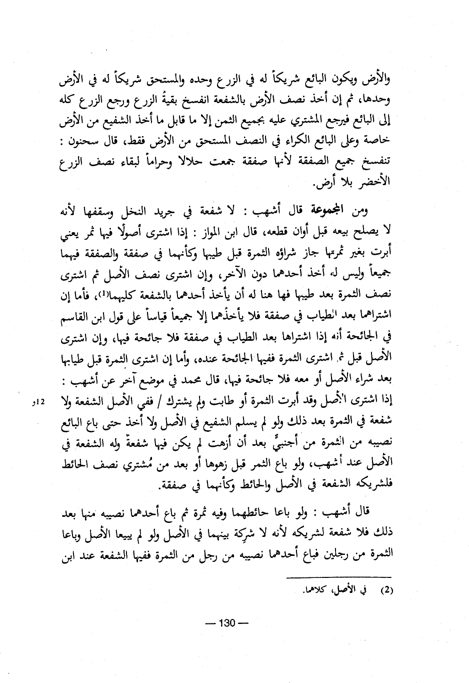 قال أشهب: ولو باع حائطهما وفيه ثمرة ثم باع أحدهما نصيبه منها بعد ذلك فلا شفعة لشريكه لأنه لا شركة بينهما في الأصل ولو لم يبيعا الأصل وباعا الثمرة من رجلين فباع أحدهما نصيبه من رجل من الثمرة ففيها الشفعة عند ابن ¬__________