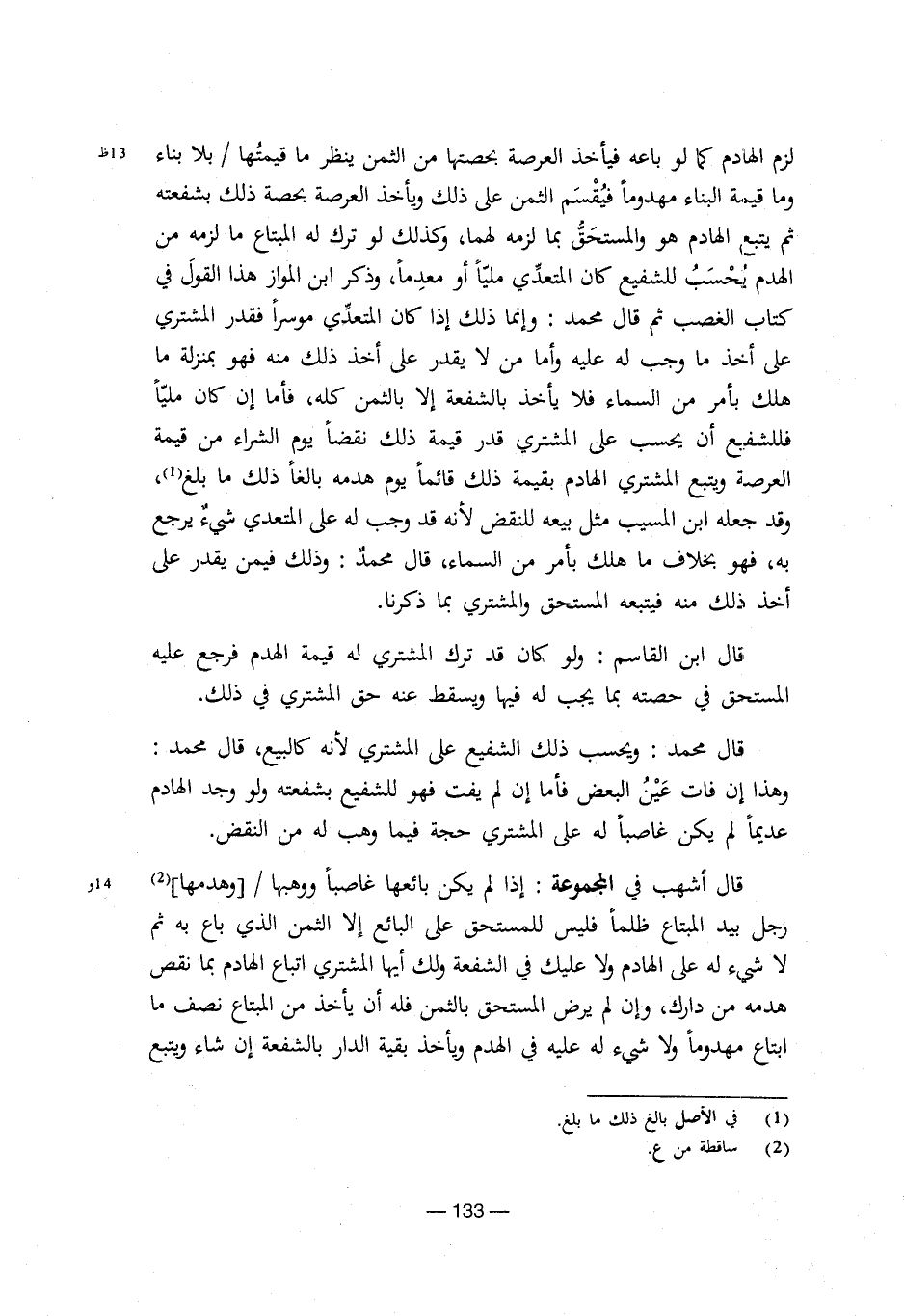 لزم الهادم كما لو باعه فيأخذ العرصة بحصتها من الثمن ينظر ما قيمتُها/ بلا بناء وما قيمة البناء مهدوماً فيُقسم الثمن على ذلك ويأخذ العرصة بحصة ذلك بشفعته ثم يتبع الهادم هو والمستحق بما لزمه لهما، وكذلك لو ترك له المبتاع ما لزمه من الهدم يُحسب للشفيع كان المتعدي ملياً أو معدماً، وذكر ابن المواز هذا القول في كتاب الغصب ثم قال محمد: وإنما ذلك إذا كان المتعدي موسراً فقدر المشتري على أخذ ما وجب له عليه وأما من لا يقدر على أخذ ذلك منه فهو بمنزلة ما هلك بأمر من السماء فلا يأخذ بالشفعة إلا بالثمن كله، فأما إن كان ملياً فللشفيع أن يحسب على المشتري قدر قيمة ذلك نقصاً يوم الشراء من قيمة العرصة ويتبع المشتري الهادم بقيمة ذلك قائماً يوم هدمه بالغاً ذلك ما بلغ (¬1)، وقد جعله ابن المسيب مثل بيعه للنقض لأنه قد وجب له على المتعدي شيء يرجع به، فهو بخلاف ما هلك بأمر من السماء، قال محمد: وذلك فيمن يقدر على أخذ ذلك منه فيتبعه المستحق والمشتري بما ذكرنا.
