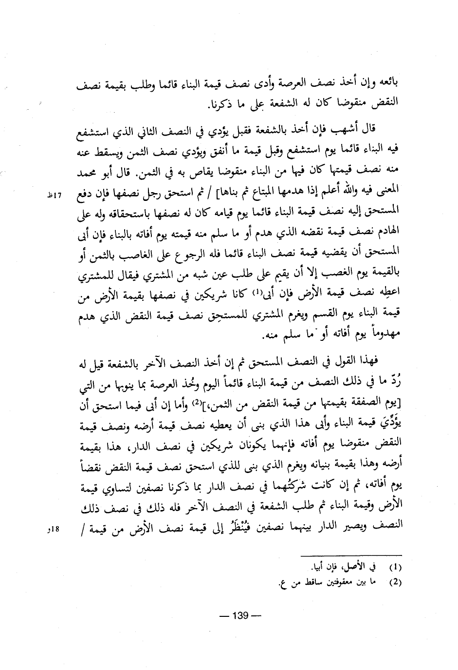 فهذا القول في النصف المستحق ثم إن أخذ النصف الآخر بالشفعة قيل له رُد ما في ذلك النصف من قيمة البناء قائماً اليوم وخُذ العرصة بما ينوبها من التي [يوم الصفقة بقيمتها من قيمة النقض من الثمن،] (¬2) وأما إن أبى فيما استحق أن يؤدي قيمة البناء وأبى هذا الذي بنى أن يعطيه نصف قيمة أرضه ونصف قيمة النقض منقوضاً يوم أفاته فإنهما يكونان شريكين في نصف الدار، هذا بقيمة أرضه وهذا بقيمة بنيانه ويغرم الذي بنى للذي استحق نصف قيمة النقض نقضاً يوم أفاته، ثم إن كانت شركتهما في نصف الدار بما ذكرنا نصفين لتساوي قيمة الأرض وقيمة البناء ثم طلب الشفعة في النصف الآخر فله ذلك في نصف ذلك النصف ويصير الدار بينهما فيُنظر إلى قيمة نصف الأرض من قيمة/ ¬__________