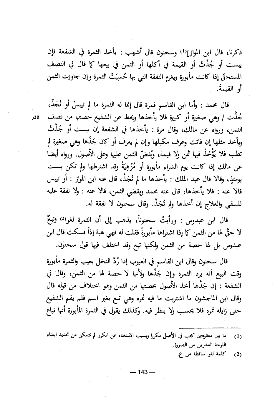 قال محمد: وأما ابن القاسم فمرة قال إنما له الثمرة ما لم تيبس أو تُجذ، جُذت/ وهي صغيرة أو كبيرة فلا يأخذها ويحط عن الشفيع حصتها من نصف الثمن، ورواه عن مالك، وقال مرة: يأخذها في الشفعة إن يبست أو جُذت ويأخذ مثلها إن فاتت وعرف مكيلها وإن لم يعرف أو كان جذها وهي صغيرة لم تطب فلا يُؤخذ فيها ثمن ولا قيمة، ويُفض الثمن عليها وعلى الأصول. ورواه أيضاً عن مالك إذا كانت يوم الشراء مأبورة أو مُزهية وقد اشترطها ولم تكن يبست يومئذٍ، وقالا قال عبد الملك: يأخذها ما لم تُجذ، قال عنه ابن المواز: أو تيبس قالا عنه: فلا يأخذها، قال عنه محمد ويقضي الثمن، قالا عنه: ولا نفقة عليه للسقي والعلاج إن أخذها ولم تُجذ. وقال سحنون لا نفقة له.