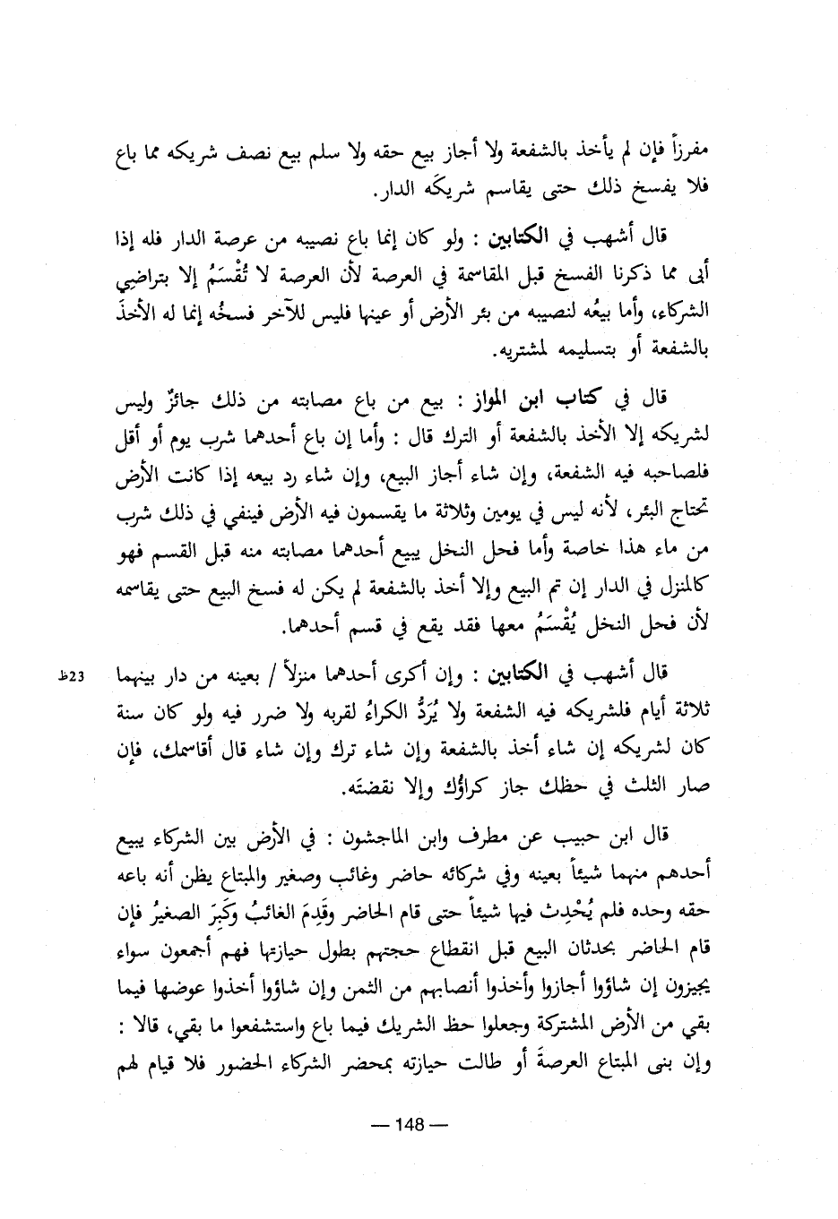 قال في كتاب ابن المواز: بيع من باع مصابته من ذلك جائزٌ وليس لشريكه الأخذ بالشفعة أو الترك قال: وأما إن باع أحدهما شرب يوم أو أقل فلصاحبه فيه الشفعة، وإن شاء أجاز البيع، وإن شاء رد بيعه إذا كانت الأرض تحتاج البئر، لأنه ليس في يومين وثلاثة ما يقسمون فيه الأرض فينفي في ذلك شرب من ماء هذا خاصة وأما فحل النخل يبيع أحدهما مصابته منه قبل القسم فهو كالمنزل في الدار إن تم البيع وإلا أخذ بالشفعة لم يكن له فسخ البيع حتى يقاسمه لأن فحل النخل يُقسم معها فقد يقع في قسم أحدهما.