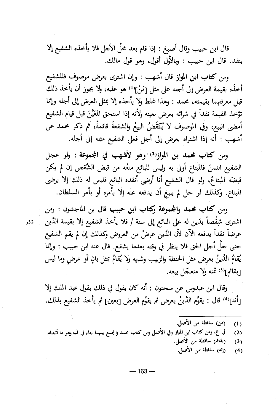 ومن كتاب محمد والمجموعة وكتاب ابن حبيب قال بن الماجشون: ومن اشترى شِقصاً بدين له على البائع إلى سنة/ فلا يأخذ الشفيع إلا بقيمة الدين عرضاً نقداً يدفعه الآن لأن الدين عرضٌ من العروض وكذلك إن لم يقم الشفيع حتى حل أجل الحق فلا ينظر في وقته بعدما يشفع. قال عنه ابن حبيب: وإنما يُقام الدينُ بعرض مثل الحنطة والزبيب وشبهه ولا يُقامُ بمثل بانٍ أو عرضٍ وما ليس [بقائم] (¬3) ثمنه ولا متعجل بيعه.