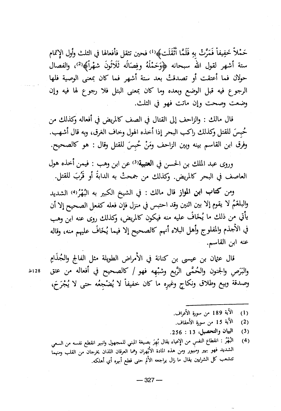 حَمْلاً خَفِيفاً فَمَرَّتْ بِهِ فَلَمَّا أُثْقَلَت) [الأعراف: الآية189] فحين تثقل فأفعالها في الثلث وأول الإتمام ستة أشهر لقول الله سبحانه (وَحَمْلُهُ وفِصَالُه ثَلاَثُونَ شهْراً) [الأحقاف: الآية 15]، والفصال حولان فما أعتقت أو تصدقت بعد ستة أشهر فما كان بمعنى الوصية فلها الرجوع فيه قبل الوضع وبعده وما كان بمعنى البتل فلا رجوع لها فيه وإن وضعت وصحت وإن ماتت فهو في الثلث.