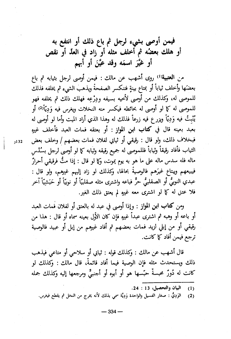 من العتبية (¬1) روى أشهب عن مالك: فيمن أوصى لرجل بثيابه ثم باع بعضها وأخلف ثياباً أو بمتاع بينةٍ فتنكسر الصفحة ويذهب الشيء ثم يخلفه فذلك للموصى له، وكذلك من أوصى لأخيه بسيفه ودرعه فهلك ذلك ثم يخلفه فهو للموصى له كما لو أوصى له بحائطه فيكسر منه النخلات ويغرس فيه ودياً (¬2) أو يُنبتُ فيه ودياً ويزرع فيه زرعاً فذلك له وهذا الذي أراد الميت وأما لو أوصى له بعبد بعينه قال في كتاب ابن المواز: أو بعتقه فمات العبد فأخلف غيره فبخلاف ذلك، ولو قال: رقيقي أو ثيابي لفلان فمات بعضهم/ وخلف بعض الثياب فأفاد رقيقاً وثياباً فللموصى له جميع رقيقه وثيابه كما لو أوصى لرجل بسُدس ماله فله سدس ماله على ما هو به يوم يموت، وكما لو قال: إذا مت فرقيقي أحرارٌ فيبيعهم ويبتاع غيرهم فالوصية بحالها، وكذلك لو زاد إليهم غيرهم، ولو قال: عبدي النوبي أو الصقلبي حر فباعه واشترى مثله صقلبياً أو نوبياً أو حبشياً آخر فلا عتق له كما لو اشترى معه غيره لم يعتق ذلك الغير.