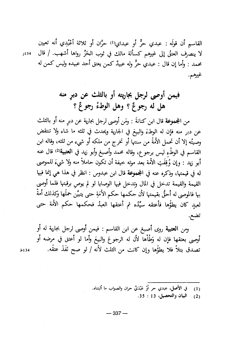 من المجموعة قال ابن كنانة: ومن أوصى لرجل بجارية عن دبرٍ منه أو بالثلث عن دبر منه فإن له الوطء والبيع في الجارية ويحدث في ثلثه ما شاء ولا تنتقض وصيتُه إلا أن تحمل الأمة من سنتها أو تخرج من ملكه أو شيء من ثلثه، وقاله ابن القاسم في الوطء ليس برجوع، وقاله محمد وأصبغ وأبو زيد في العتبية (¬2) قال عنه أبو زيد: وإن وُقفت الأمة بعد موته خيفة أن تكون حاملاً منه ولا شيء للموصى له في قيمتها، وذكره عنه في المجموعة قال ابن عبدوس: انظر في هذا هي إنما فيها القيمة والقيمة تدخل في المال وتدخل فيها الوصايا لو لم يوصِ برقبتها فلما أوصى بها فالموصى له أحق بقيمتها لأن حكمها حكم الأمة حتى يتبين حملُها وكذلك أمةً لعبدٍ كان يطؤها فأعتقه سيده ثم أعتقها العبدُ فحكمها حكم الأمة حتى تضع.