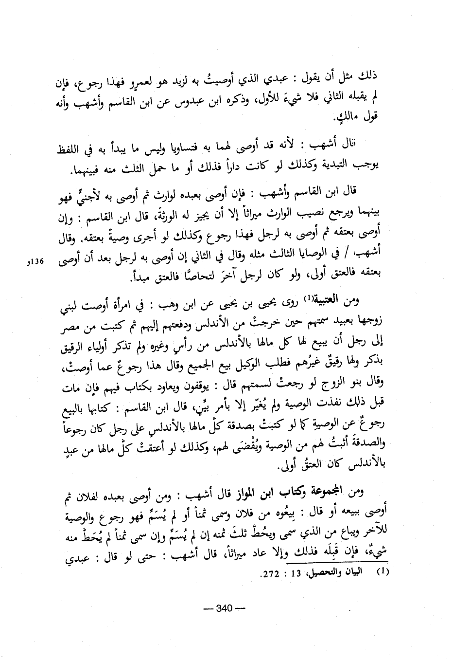 ومن العتبية (¬1) روى يحيى بن يحيى عن ابن وهب: في امرأة أوصت لبني زوجها بعبيد سمتهم حين خرجت من الأندلس ودفعتهم إليهم ثم كتبت من مصر إلى رجل أن يبيع لها كل مالها بالأندلس من رأسٍ وغيره ولم تذكر أولياء الرقيق بذكر ولها رقيقٌ وغيرهم فطلب الوكيل بيع الجميع وقال هذا رجوعٌ عما أوصت، وقال بنو الزوج لو رجعت لسمتهم قال: يوقفون ويعاود بكتاب فيهم فإن مات قبل ذلك نفذت الوصية ولم يُغير إلا بأمر بينٍ، قال ابن القاسم: كتابها بالبيع رجوعٌ عن الوصية كما لو كتبت بصدقة كل مالها بالأندلس على رجل كان رجوعاً والصدقة أثبتُ لهم من الوصية ويُقضى لهم، وكذلك لو أعتقت كل مالها من عبدٍ بالأندلس كان العتقُ أولى.