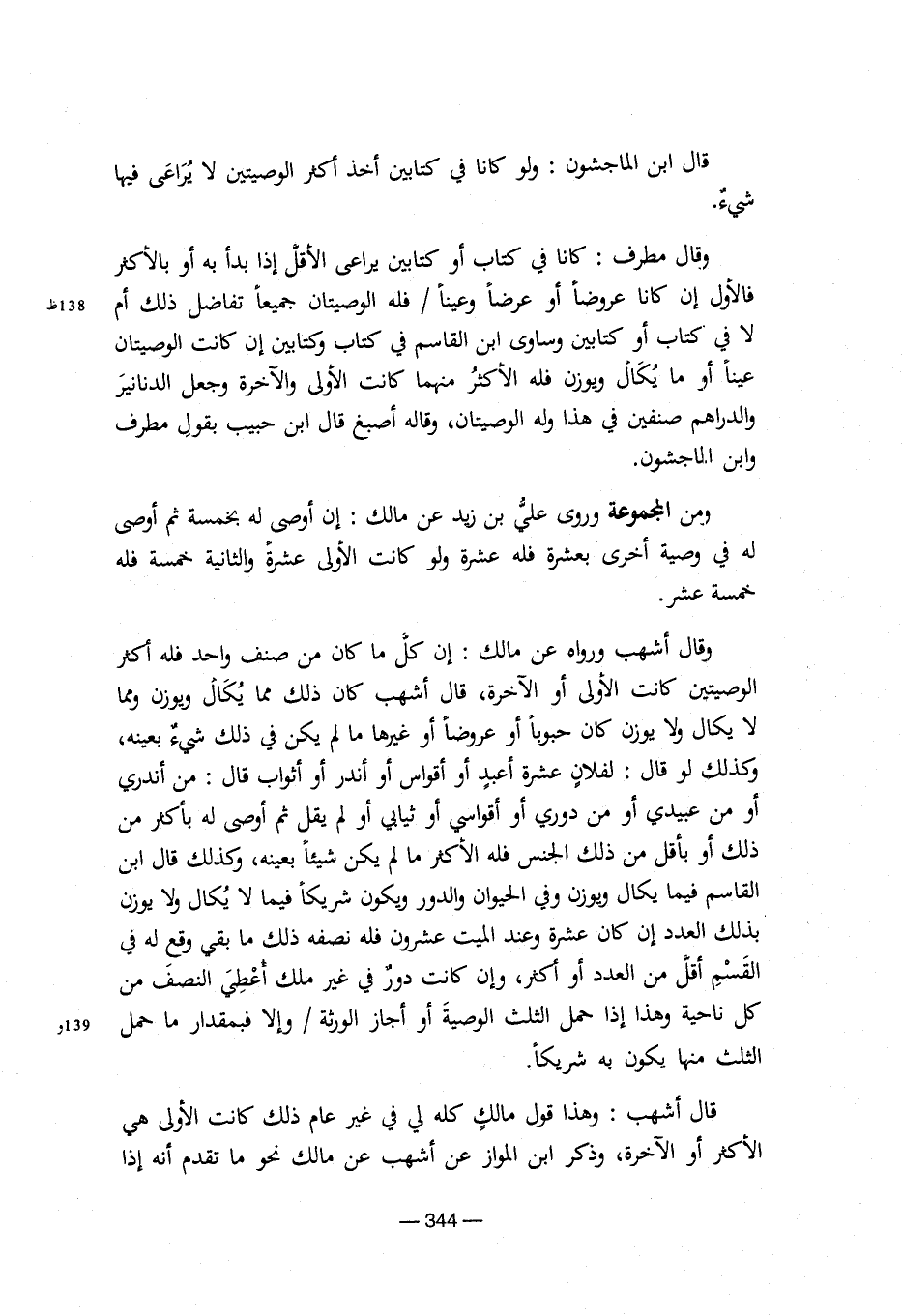وقال أشهب ورواه عن مالك: إن كل ما كان من صنف واحد فله أكثر بالوصيتين كانت الأولى أو الآخرة، قال أشهب كان ذلك مما يُكال ويوزن ومما لا يكال ولا لايوزن كان حبوباً أو عروضاً أو غيرها ما لم يكن في ذلك شيءٌ بعينه، وكذلك لو قال: لفلانٍ عشرة أعبدٍ أو أقواس أو أندر أو أثواب قال: من أندري أو من عبيدي أو من دوري أو أقواسي أو ثيابي أو لم يقل ثم أوصى له بأكثر من ذلك أو بأقل من ذلك الجنس فله الأكثر ما لم يكن شيئاً بعينه، وكذلك قال ابن القاسم فيما يكال ويوزن وفي الحيوان والدور ويكون شريكاً فيما لا يُكال ولا يوزن بذلك العدد إن كان عشرة وعند الميت عشرون فله نصفه ذلك ما بقي وقع له في القسم أقل من العدد أو أكثر، وإن كانت دورٌ في غير ملك أُعطي النصف من كل ناحية وهذا إذا حمل الثلث الوصية أو أجاز الورثة/ وإلا فبمقدار ما حمل الثلث منها يكون به شريكاً.