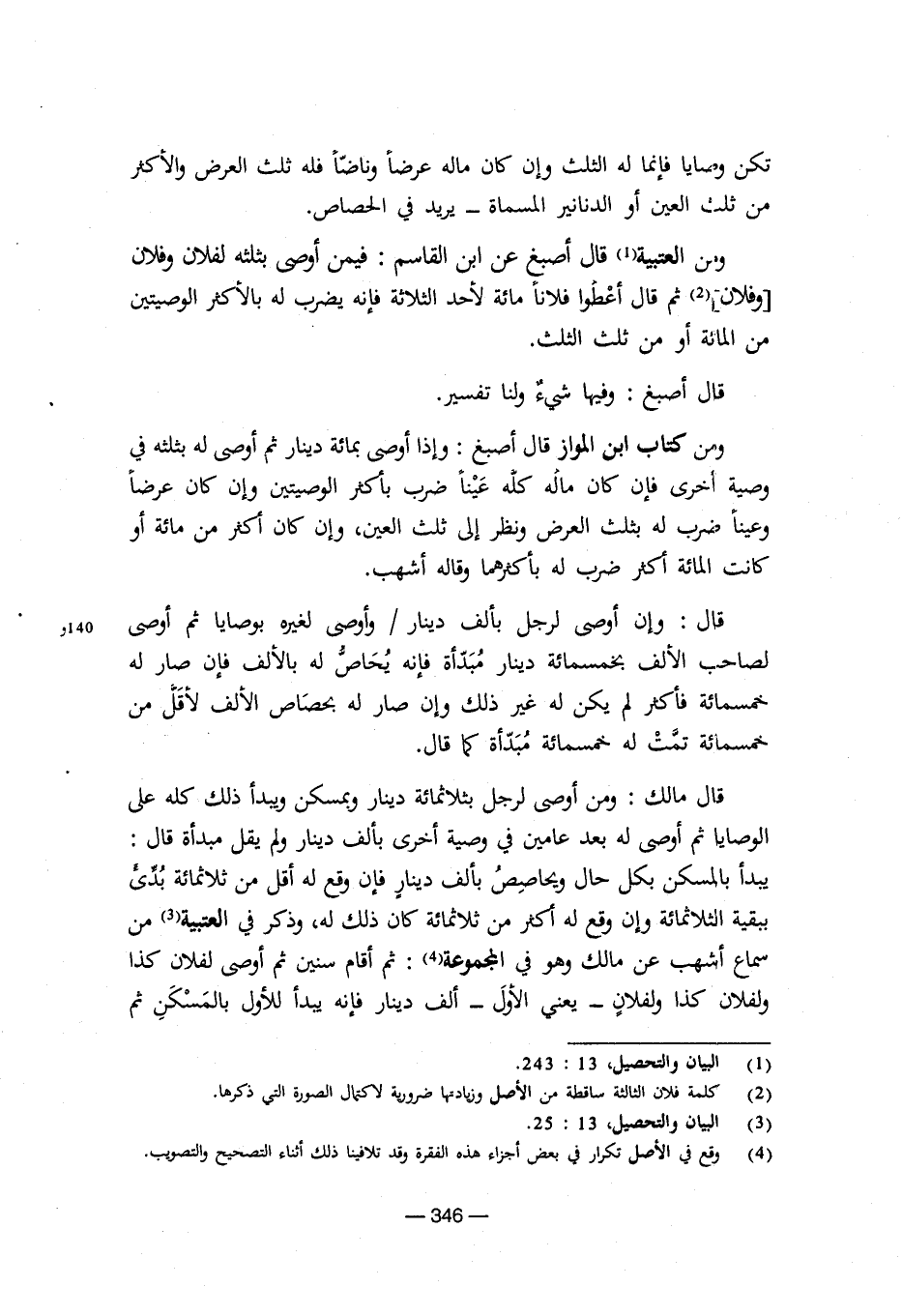 قال مالك: ومن أوصى لرجل بثلاثمائة دينار وبمسكن ويبدأ ذلك كله على الوصايا ثم أوصى له بعد عامين في وصية أخرى بألف دينار ولم يقل مبدأة قال: يبدأ بالمسكن بكل حال ويحاصص بألف دينارٍ فإن وقع له أقل من ثلاثمائة بُدئ ببقية الثلاثمائة وإن وقع له أكثر من ثلاثمائة كان ذلك له، وذكر في العتبية (¬3) من سماع أشهب عن مالك وهو في المجموعة (¬4): ثم أقام سنين ثم أوصى لفلان كذا ولفلان كذا ولفلانٍ – يعني الأول- ألف دينار فإنه يبدأ للأول بالمسكنِ ثم ¬__________