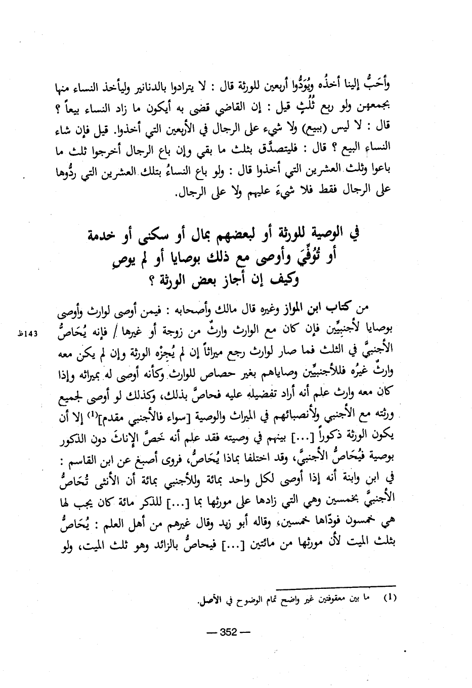 من كتاب ابن المواز وغيره قال مالك وأصحابه: فيمن أوصى لوارث وأوصى بوصايا لأجنبيين فإن كان مع الوارث وارث من زوجة أو غيرها/ فإنه يُحاص الأجنبي في الثلث فما صار لوارث رجع ميراثاً إن لم يُجزه الورثة وإن لم يكن معه وارثٌ غيرُه فللأجنبيين وصاياهم بغير حصاص للوارث وكأنه أوصى له بميراثه وإذا كان معه وارث علم أنه أراد تفضيله عليه فحاص بذلك، وكذلك لو أوصى لجميع ورثته مع الأجنبي ولأنصبائهم في الميراث والوصية [سواء فالأجنبي مقدم] (¬1) إلا أن يكون الورثة ذكوراً [ ... ] بينهم في وصيته فقد علم أنه خص الإناث دون الذكور بوصية فيُحاص الأجنبي، وقد اختلفا بماذا يُحاص، فروى أصبغ عن ابن القاسم: في ابن وابنة أنه إذا أوصى لكل واحد بمائة وللأجنبي بمائة أن الأنثى تُحاص الأجنبي بخمسين وهي التي زادها على مورثها بما [ ... ] للذكر مائة كان يجب لها هي خمسون فوداها خمسين، وقاله أبو زيد وقال غيرهم من أهل العلم: يُحاص بثلث الميت لأن مورثها من مائتين [ ... ] فيحاص بالزائد وهو ثلث الميت، ولو ¬__________