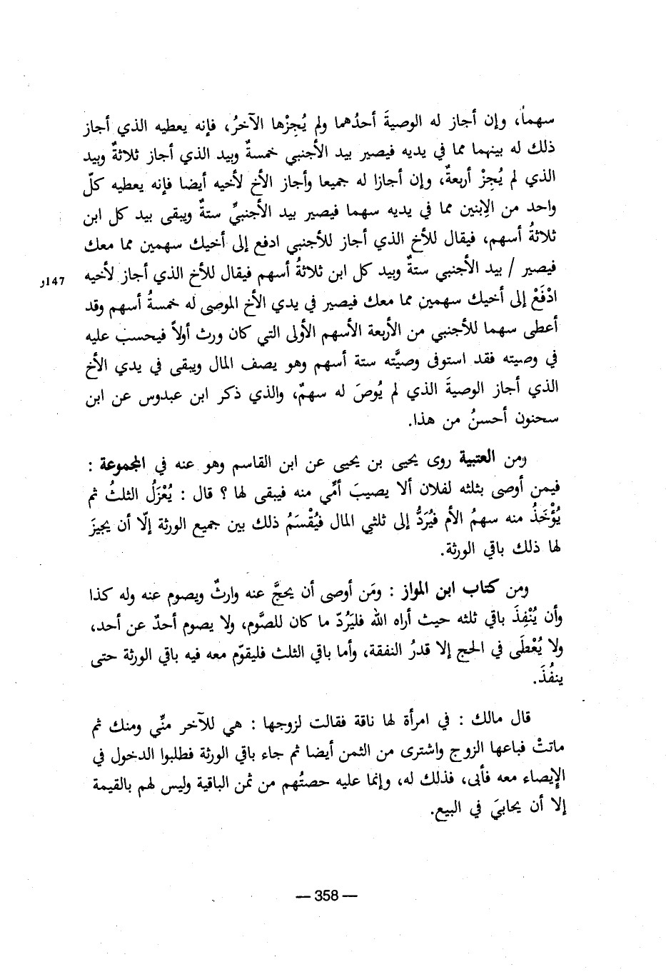 ومن العتبية روى يحيى بن يحيى عن ابن القاسم وهو عنه في المجموعة: فيمن أوصى بثلثه لفلان ألا يصيب أمي منه فيبقى لها؟ قال: يُعزل الثلثُ ثم يُؤخذ منه سهمُ الأم فيُرد إلى ثلثي المال فيُقسم ذلك بين جميع الورثة إلا أن يجيز لها ذلك باقي الورثة.