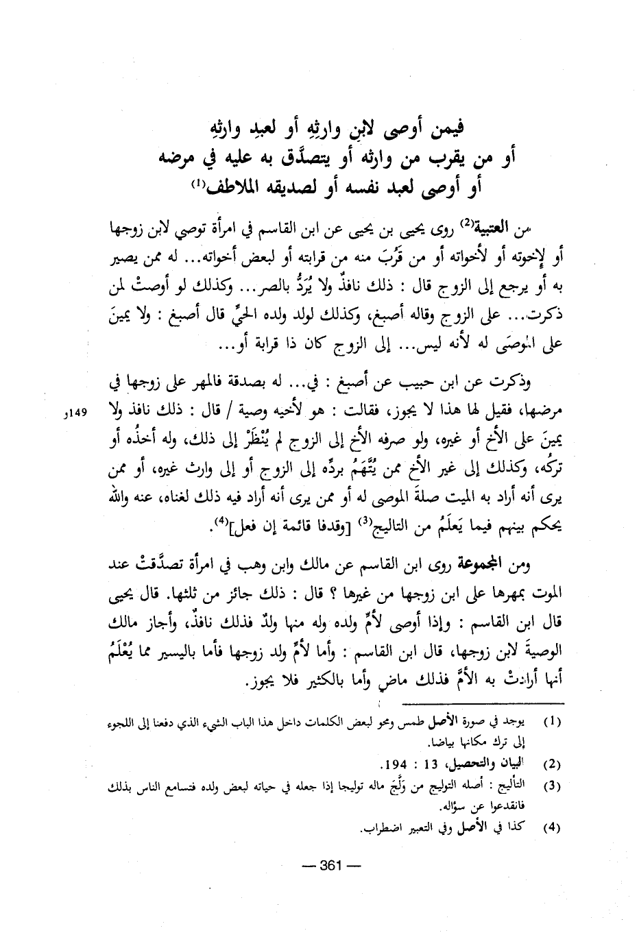 من العتبية (¬2) روى يحيى بن يحيى عن ابن القاسم في امرأة توصي لابن زوجها أو لإخوته أو لأخواته أو من قرُب منه من قرابته أو لبعض أخواته ... له ممن يصير به أو يرجع إلى الزوج وقاله أصبغ، وكذلك لولد ولده الحي قال أصبغ: ولا يمين على الموصى له لأنه ليس ... إلى الزوج كان ذا قرابة أو ...