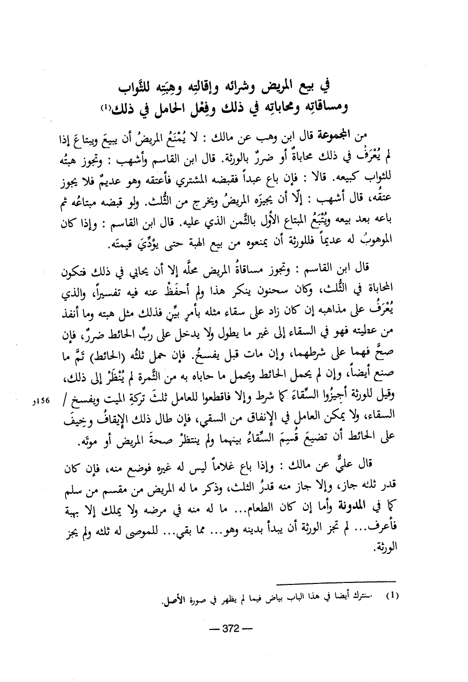 قال ابن القاسم: وتجوز مساقاة المريض محله إلا أن يحابي في ذلك فتكون المحاباة في الثلث، وكان سحنون ينكر هذا ولم أحفظ عنه فيه تفسيراً، والذي يُعرف على مذاهبه إن كان زاد على سقاء مثله بأمرٍ بين فذلك مثل هبته وما أنفذ من عطيته فهو في السقاء إلى غير ما يطول ولا يدخل على رب الحائط ضررٌ، فإن صح فهما على شرطهما، وإن مات قبل يفسخُ. فإن حمل ثلثُه (الحائط) تم ما صنع أيضاً، وإن لم يحمل الحائط ويحمل ما حاباه به من الثمرة لم يُنظر إلى ذلك، وقيل للورثة أجيزُوا السقاء كما شرط وإلا فاقطعوا للعامل ثلث تركة الميت ويفسخ/ السقاء، ولا يمكن العامل في الإنفاق من السقي، فإن طال ذلك الإيقافُ وخِيف على الحائط أن تضيع قُسِمَ السقاءُ بينهما ولم ينتظر صحة المريض أو موته.