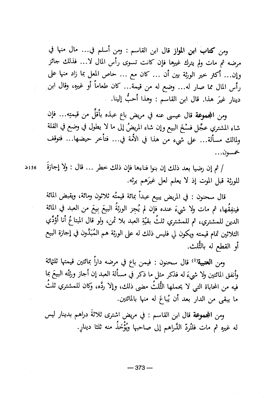 ومن المجموعة قال عيسى عنه في مريض باع عبده بأقل من قيمته ... فإن شاء المشتري عجَّل فسخ البيع وإن شاء المريضُ إلى ما لا يطول في وضع في القلة ولمالك مسألة ... على شيء من هذا في الأمة في ... فتأخر حيضها ... فتوقف خمسون ...