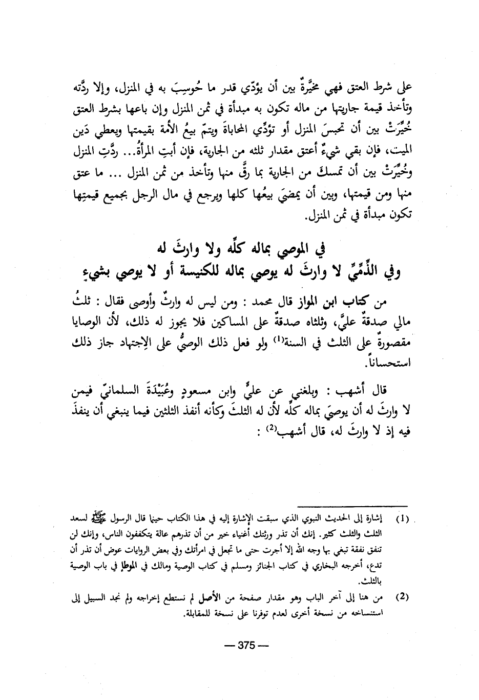 (¬1) إشارة إلى الحديث النبوي الذي سبقت الإشارة إليه في هذا الكتاب حينما قال الرسول صلى الله عليه وسلم لسعد الثلث والثلث كثير. إنك أن تذر ورثتك أغنياء خير من أن تذرهم عالة يتكففون الناس، وإنك لن تنفق نفقة تبغي بها وجه الله إلا أجرت حتى ما تجعل في امرأتك وفي بعض الروايات عوض أن تذر أن تدع، أخرجه البخاري في كتاب الجنائز ومسلم في كتاب الوصية ومالك في الموطإ في باب الوصية بالثلث.