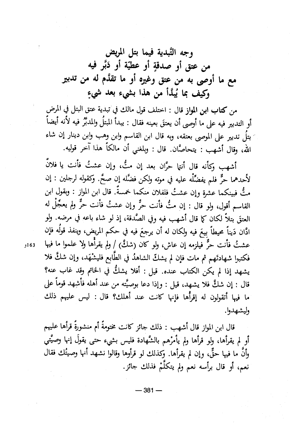 من كتاب ابن المواز قال: اختلف قول مالك في تبدية عتق البتل في المرض أو التدبير فيه على ما أوصى أن يعتق بعينه فقال: يبدأ المبتلُ والمدبرُ فيه لأنه أيضاً بتلُ تدبير على الموصى بعتقه، وبه قال ابن القاسم وابن وهب وابن دينار إن شاء الله، وقال أشهب: يتحاصان. قال: وبلغني أن مالكاً هذا آخر قوليه.