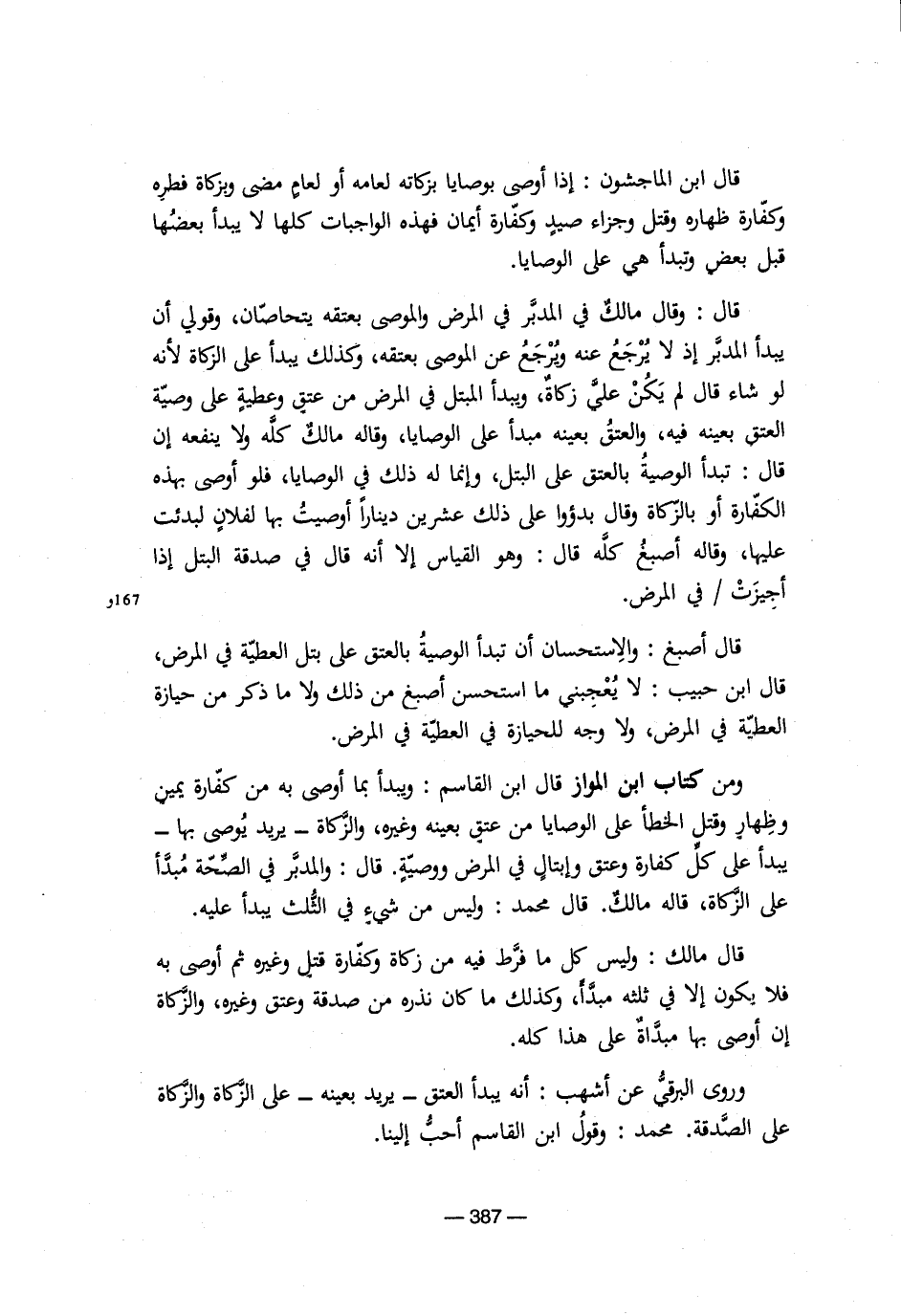 وروى البرقي عن أشهب: أنه يبدأ العتق –يريد بعينه- على الزكاة والزكاة على الصدقة. محمد: وقولُ ابن القاسم أحب إلينا.