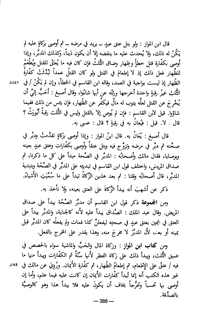 قال ابن المواز: ولو بتل عتق عبدٍ – يريد في مرضه- ثم أوصى بزكاةٍ عليه لم يكن له ذلك، ولا يُحدث عليه ما ينقضه إلا أن يكون ديناً، وكذلك المدبر، وإذا أوصى بكفارة قتلِ خطأٍ وظهار وضاق الثلث فإن كان فيه ما يُعتق للقتل ويُطعم للظهار فعل ذلك إذ لا إطعام في القتل ولو كان القتلُ عمداً لبُدئت كفارةُ الظهار إذ ليست بواجبة في العمد، وقاله ابن القاسم في الخطأ، وإن لم يكن/ في الثلث غيرُ رقبةٍ واحدة أخرجها ورثتُه عن أيها شاءوا، وقال أصبغ: أحب إلي أن يُخرج عن القتل لعله يتوب له مالٌ فيكفر عن الظهار، فإن يئس من ذلك ففيما شاؤوا. قيل لابن القاسم: فإن لم يُوص إلا بالقتل وليس في الثلث رقبةٌ أيورثُ؟ قال: لا. قيل: فيُعان به في رقبةٍ؟ قال: عسى به.